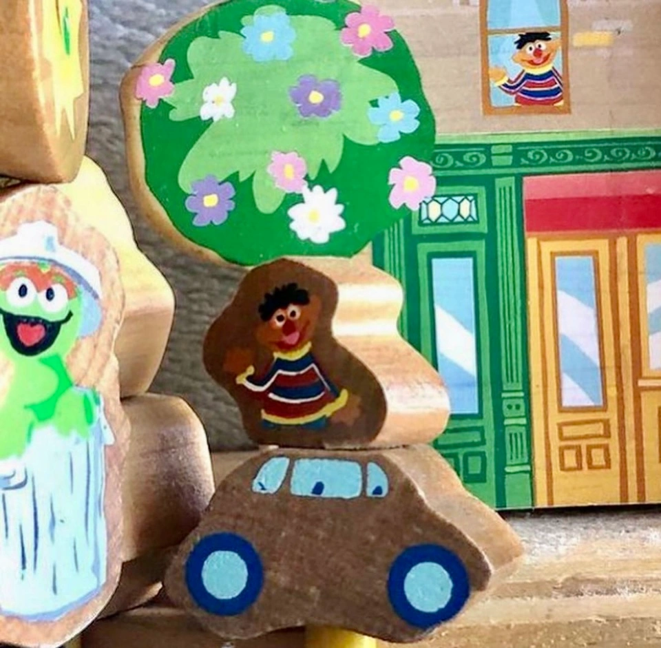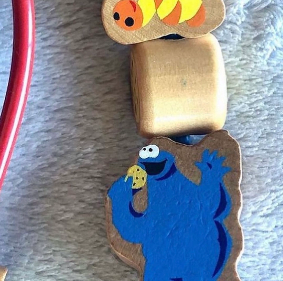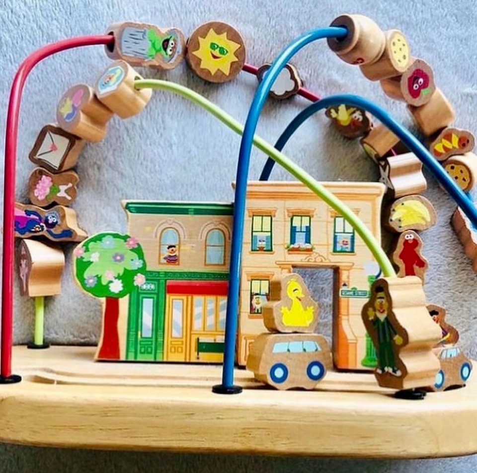 A wooden bead maze featuring Sesame Street characters. There are multiple tracks and pieces for different ages and skill levels. Includes a Sesame Street building with windows. All pieces are made of wood. This is a vintage item, it was produced before 2010.