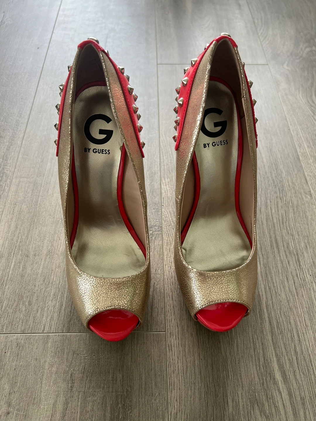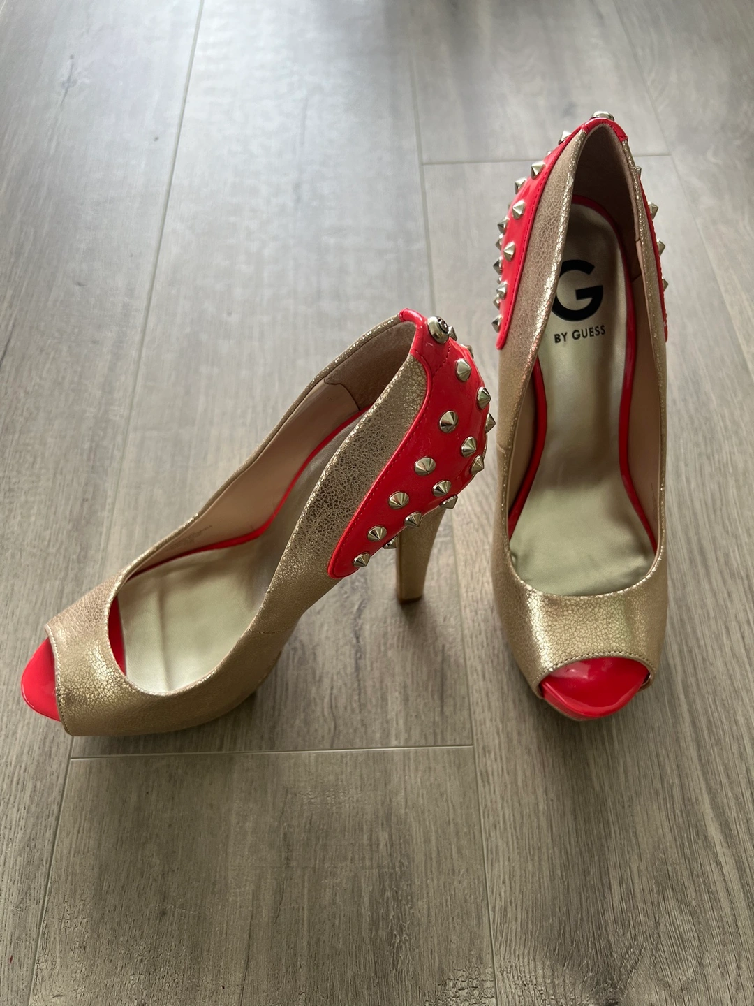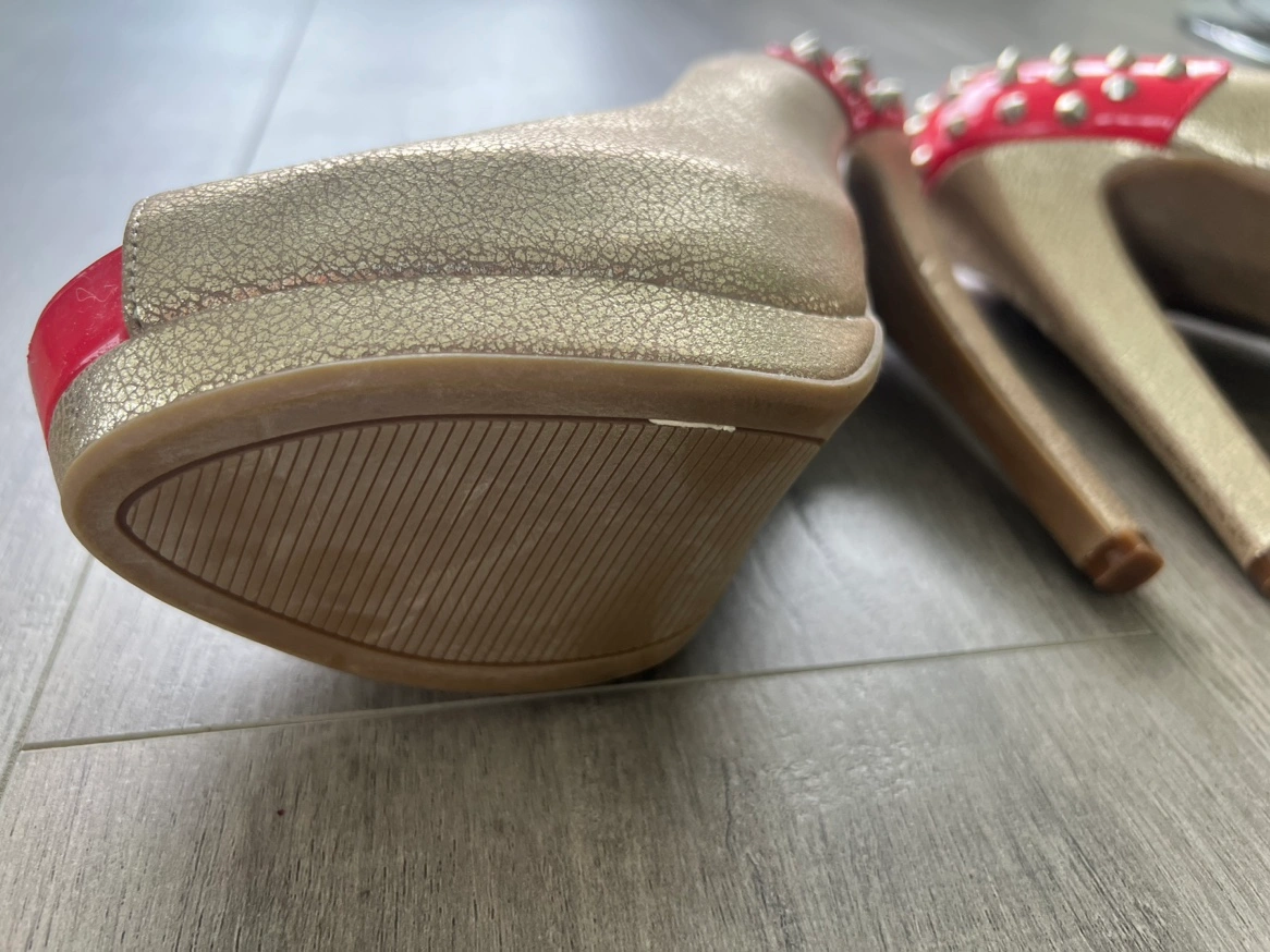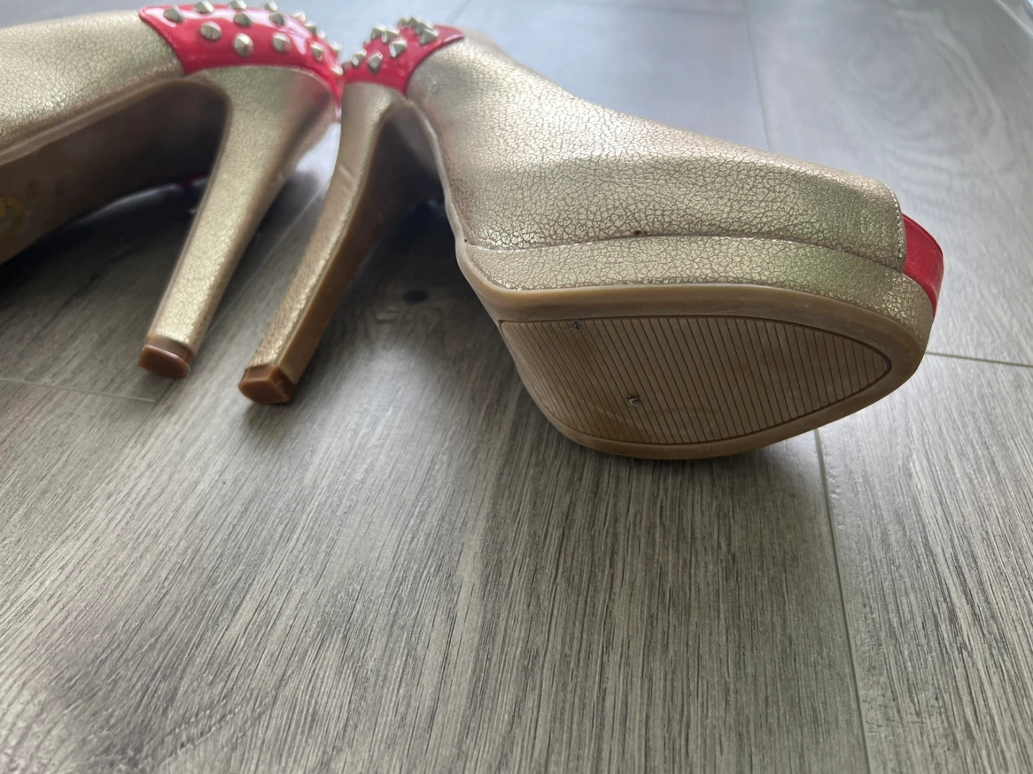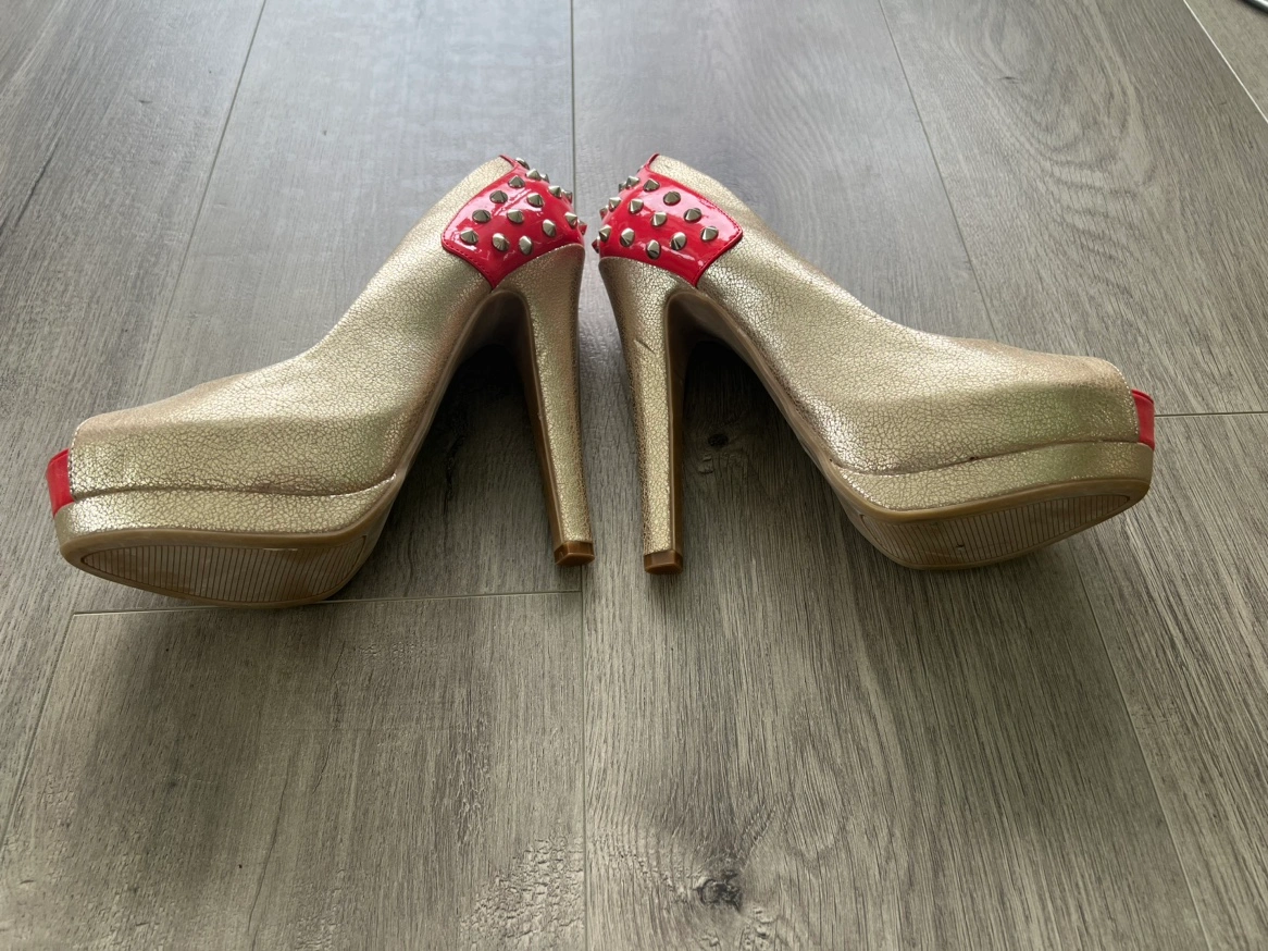 Gold peep toe heels with a red platform and heel. The heels are decorated with silver studs. Size 8.5