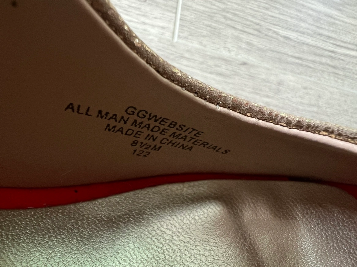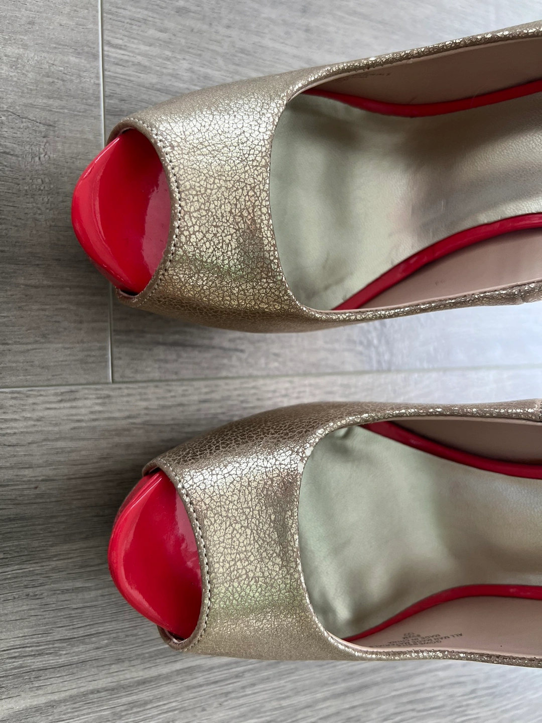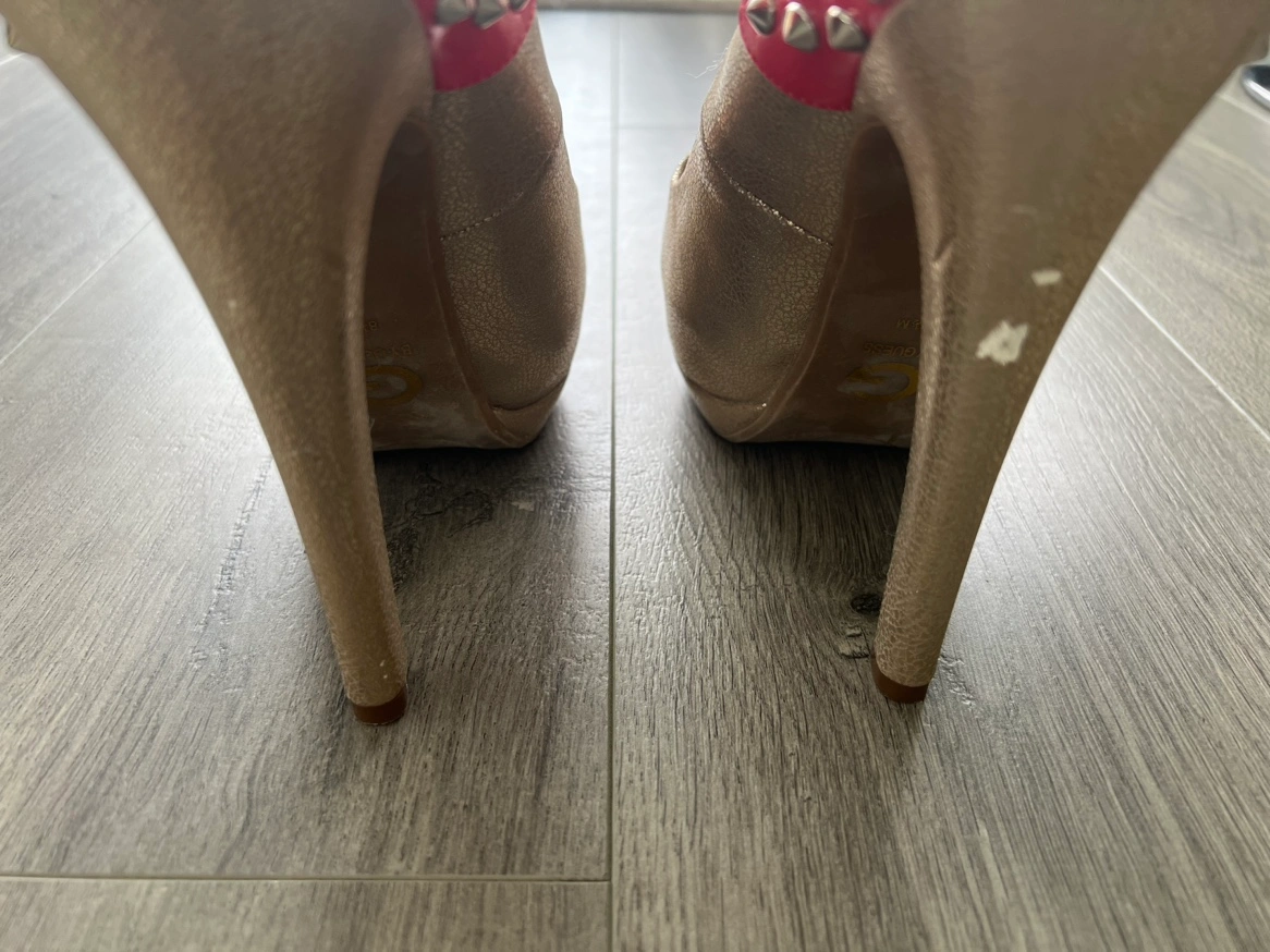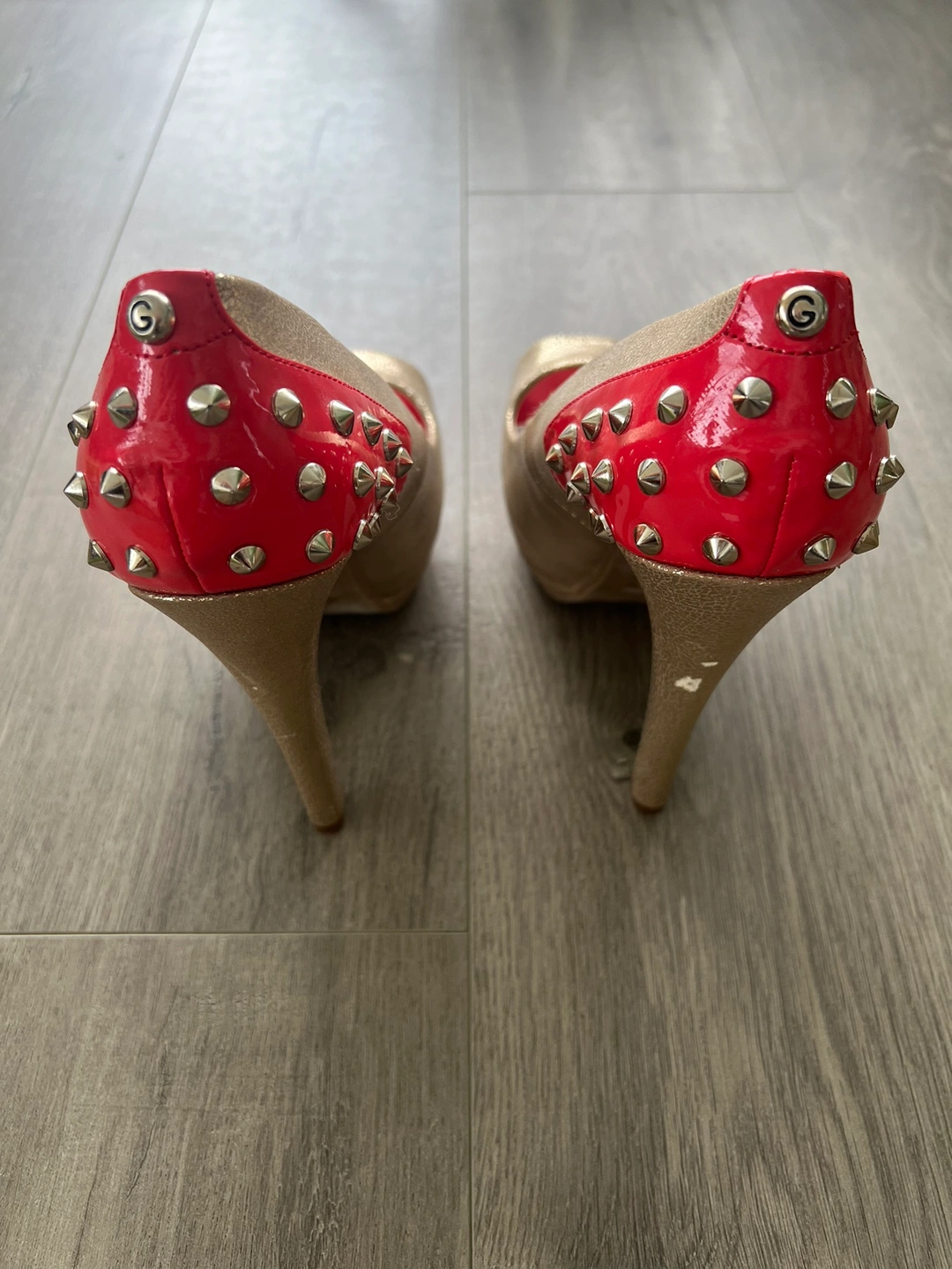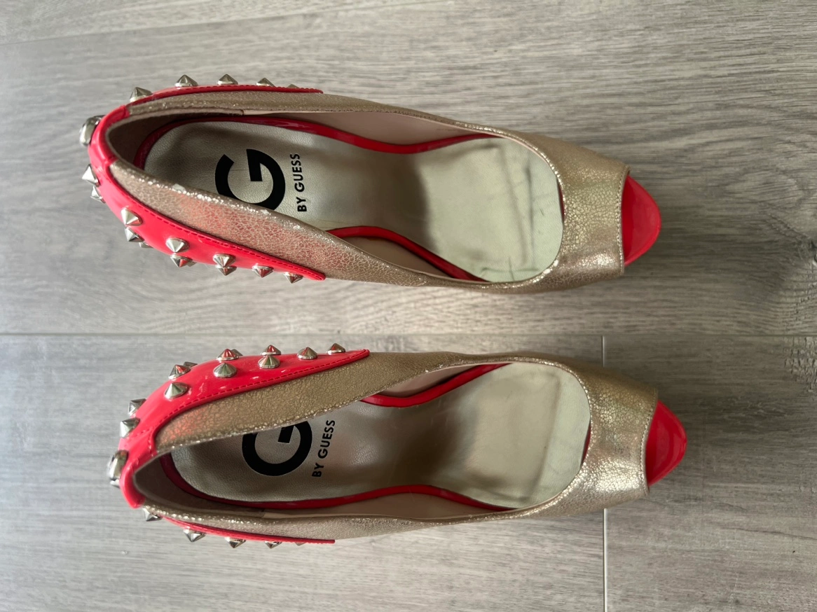 Gold peep toe heels with a red platform and heel. The heels are decorated with silver studs. Size 8.5