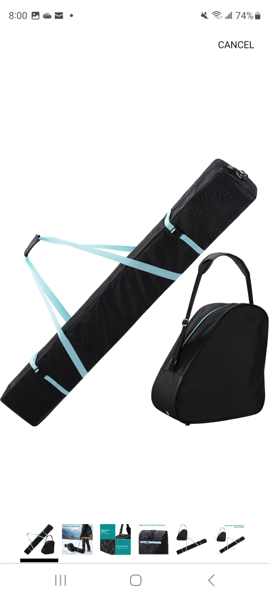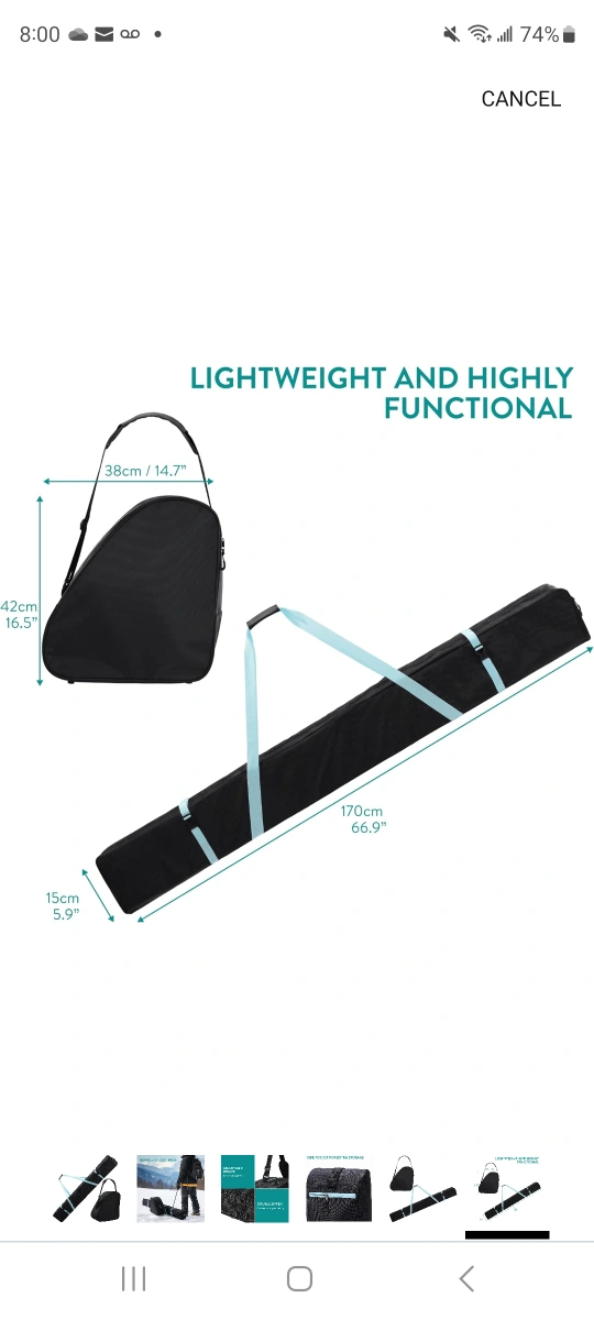 HIT THE SLOPES: Take your ski equipment with you when you travel to the mountains and resorts without any problem! The ski case with padded carrying strap is worn on your shoulder, making it easy to transport your skis. DURABLE MATERIAL: The ski bags are made of 1680D polyester, a strong and durable material, with an inner coating for dust protection. SKI BAG DETAILS: Measurements (LxWxH): 66.9" x 5.9" x 11.8" / 170 x 15 x 30 cm. The bag features a strong double zipper and adjustable compression straps on each side for a secure hold of your skis. Suitable for both men's and women's skis. BOOT BAG DETAILS: Measurements (HxLxD): 16.5" x 14.7" x 8.7" / 42 x 38 x 22 cm. The bag features a padded shoulder strap for more comfort carrying your skiing or snowboarding boots as well as an extra compartment to store winter gloves.