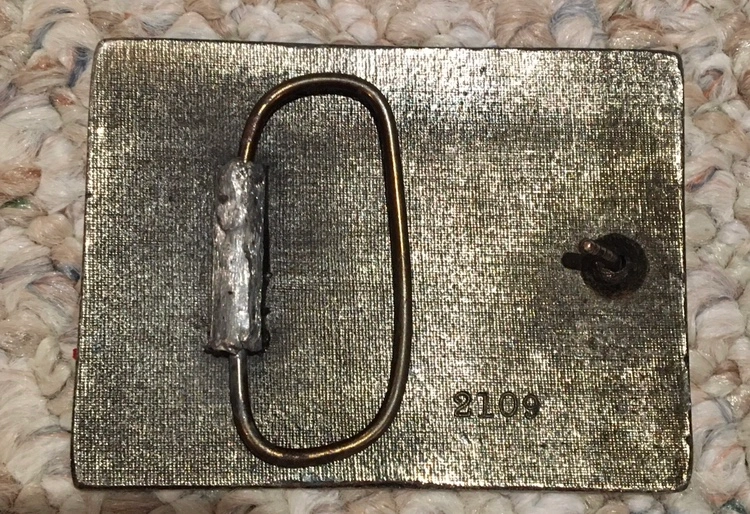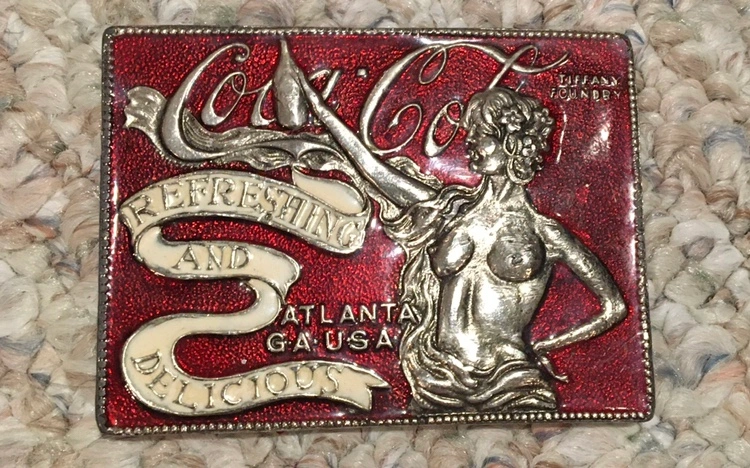 Vintage Coca Cola belt buckle featuring a woman holding a bottle of Coca Cola. The buckle has a red enamel background with a silver tone design. The buckle is approximately 2 inches wide and 1.5 inches tall. The back of the buckle features a metal clasp.