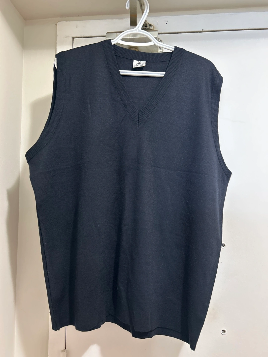 Men's black sleeveless sweater with a V-neck. Made of a soft, comfortable material. Great for layering or wearing on its own. Price is firm