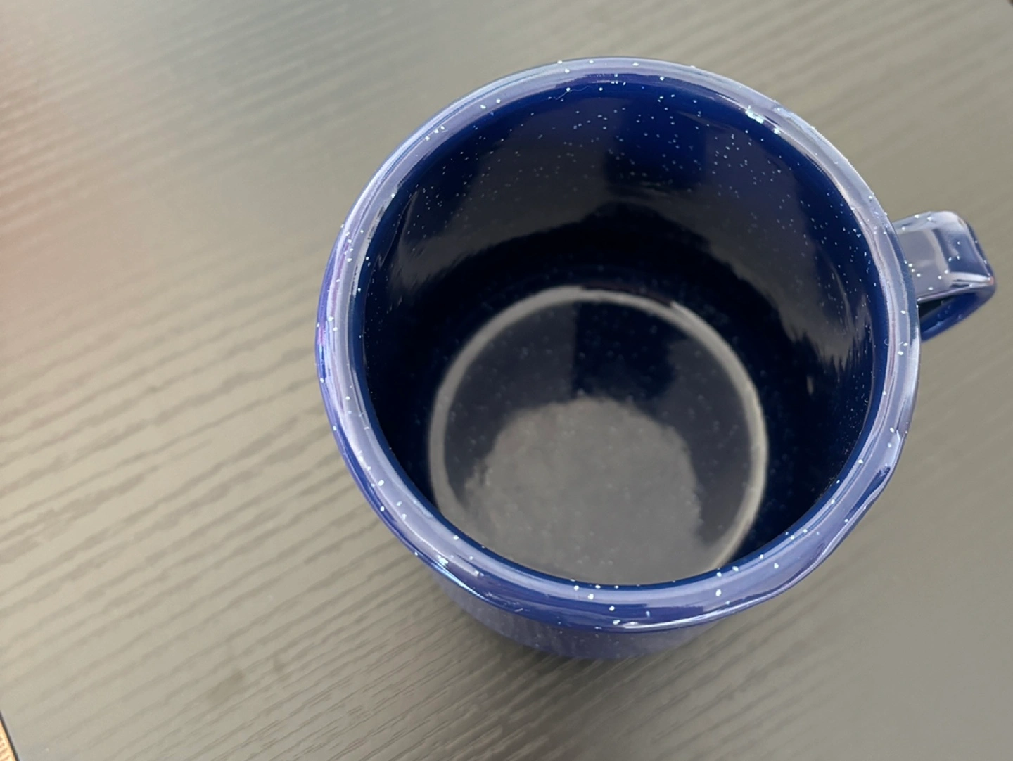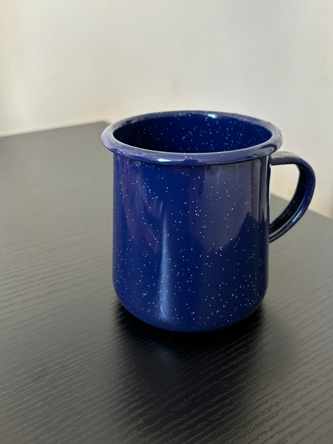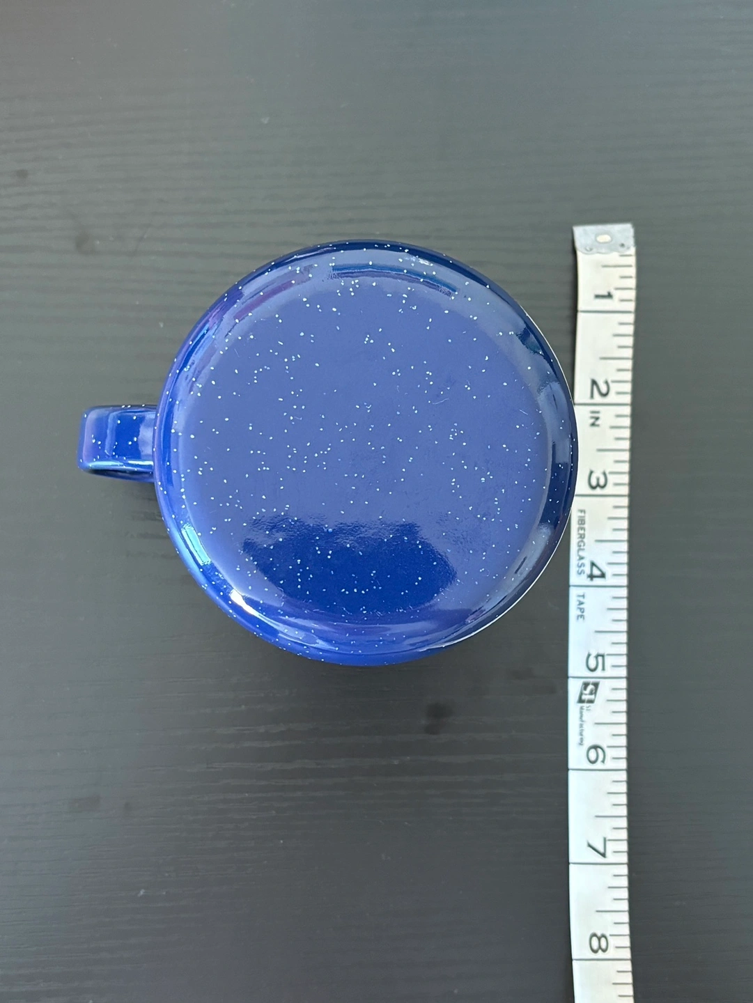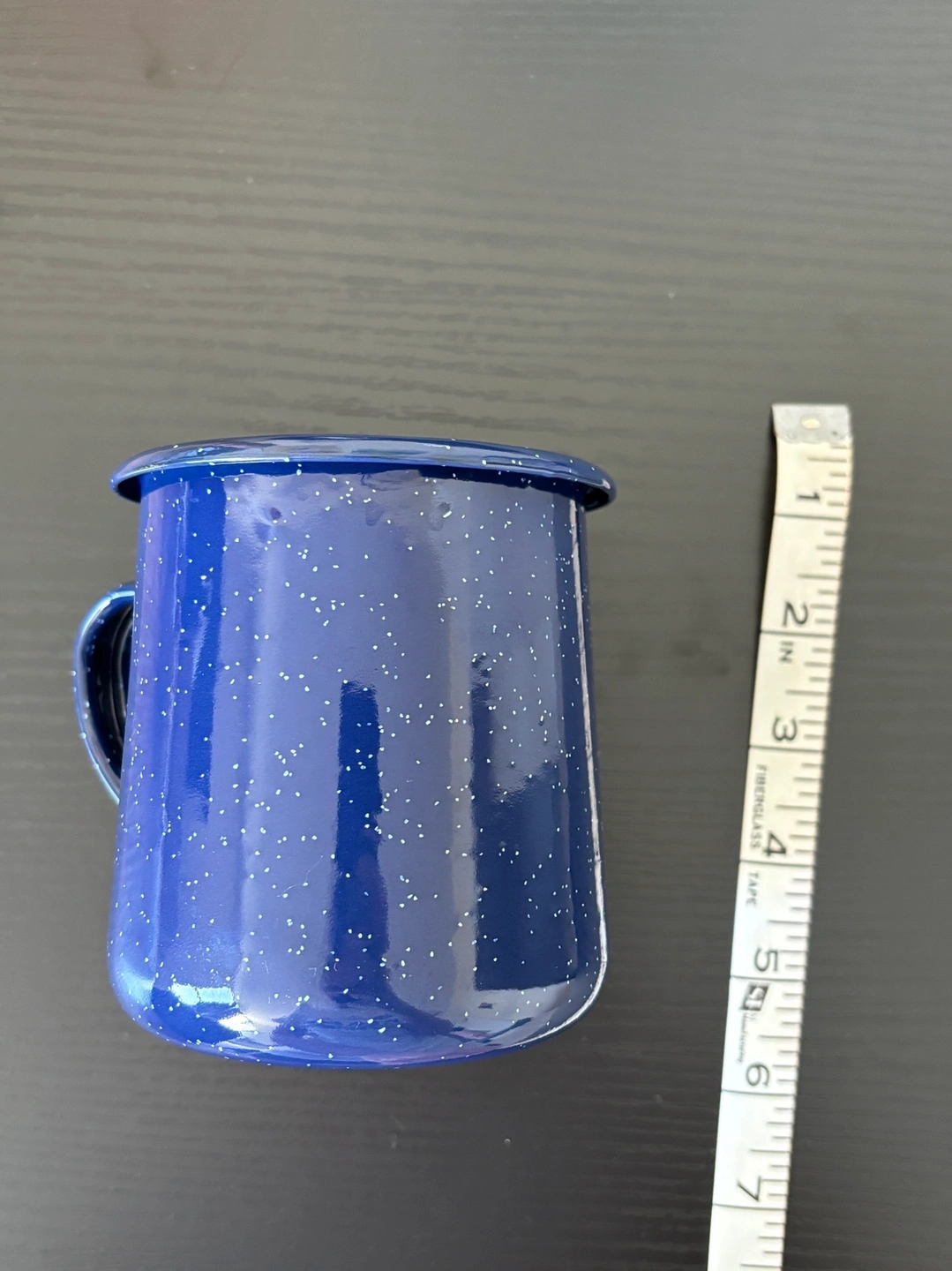Blue, speckled enamel camp mug. Holds up to 2 1/2 cups of liquid. 4” x 3.5” x 4”. Cash only! Pick up at RBC Bathurst and Sheppard.