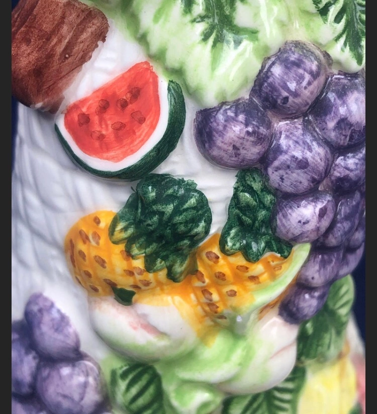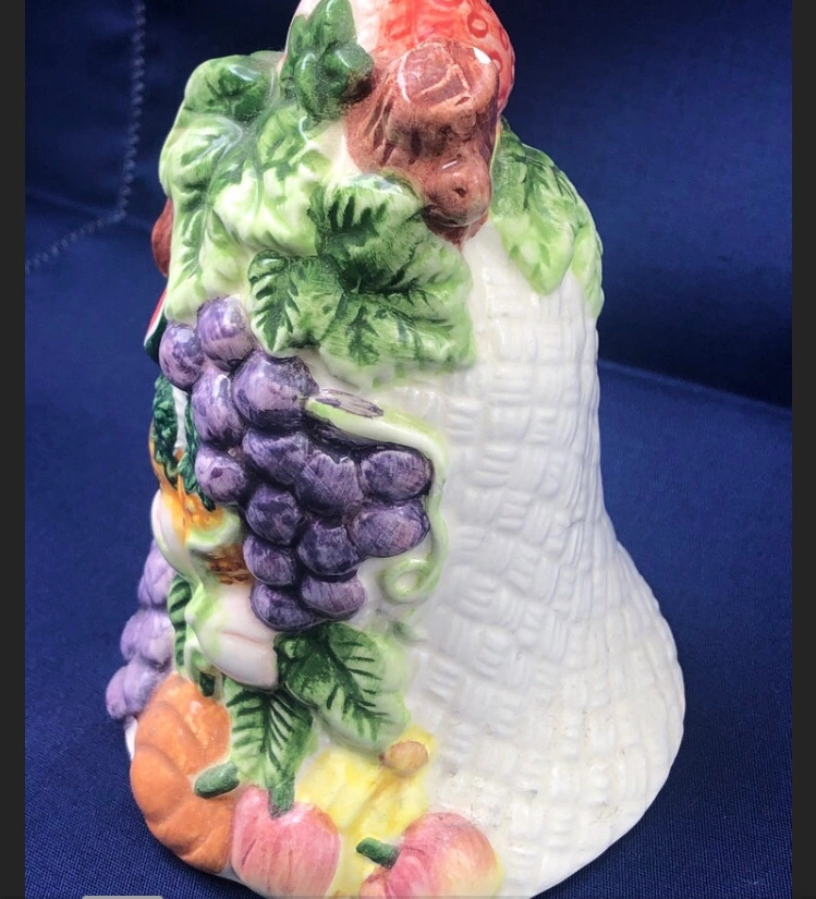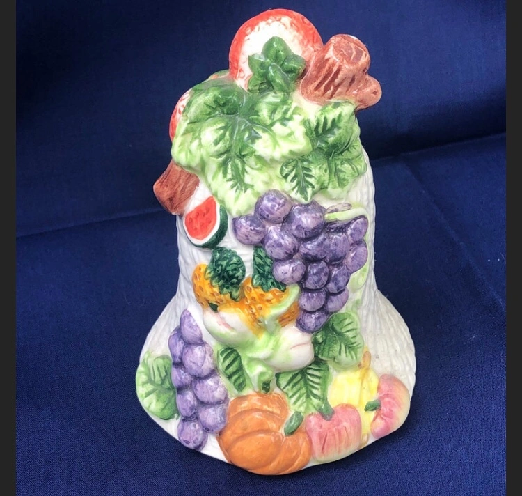 A ceramic bell in the shape of a basket filled with fruit. It has a textured white base. The bell is decorated with various fruits including grapes, a watermelon, a pineapple, a pumpkin, a peach, and other fruit. The bell is approximately 5 inches tall and 4 inches wide.