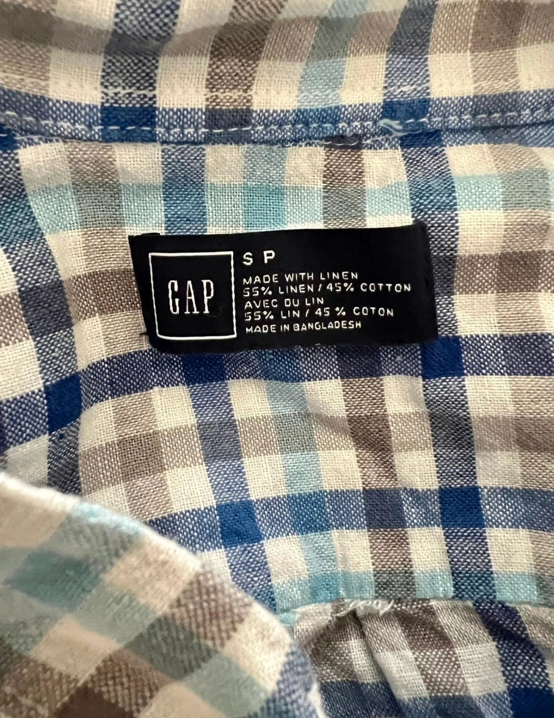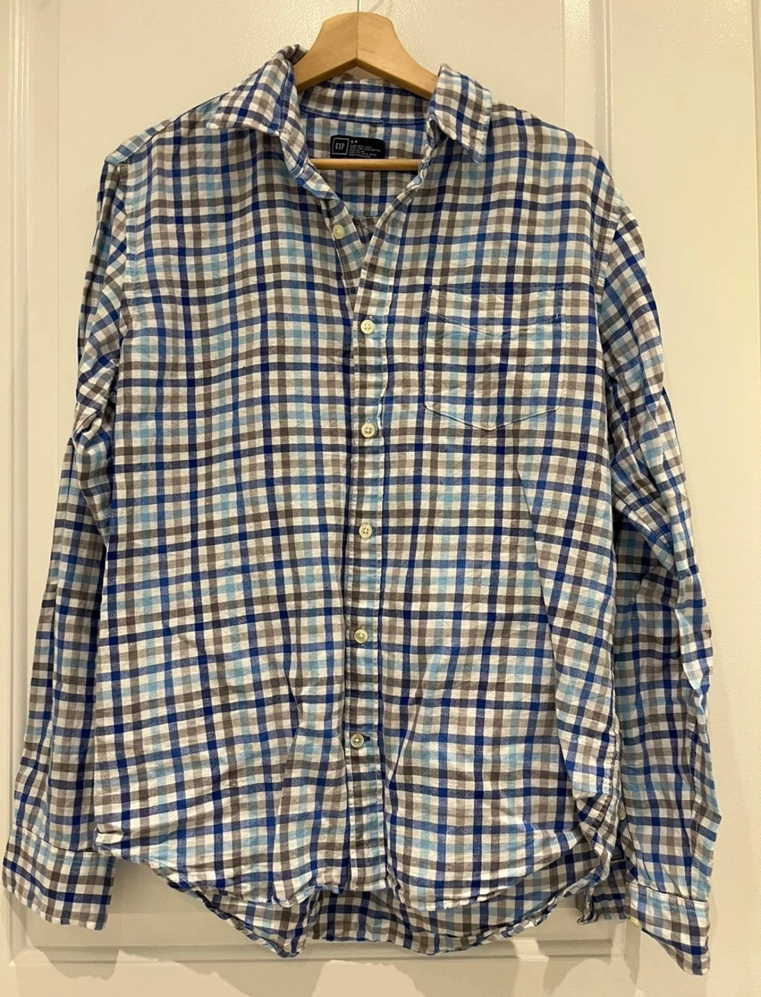Men's size small, long-sleeved button-up shirt with a plaid pattern in blue, grey, and white. Cotton, Linen mix - details in pic.