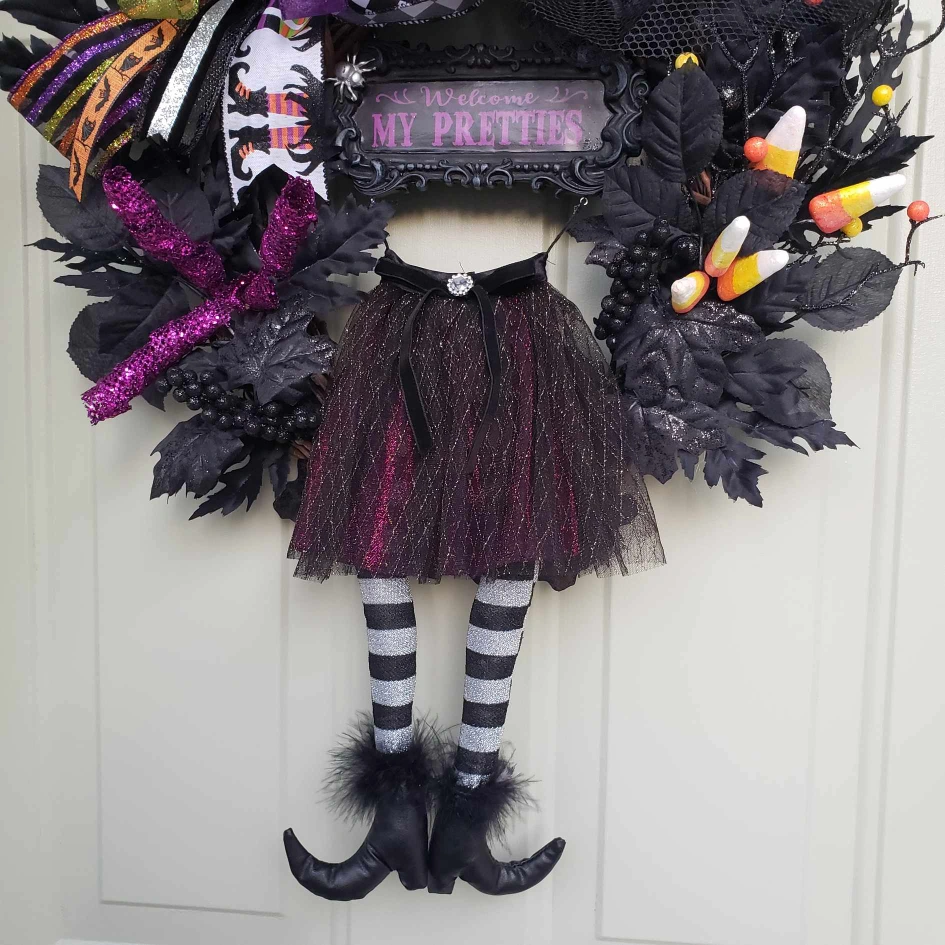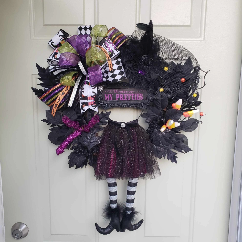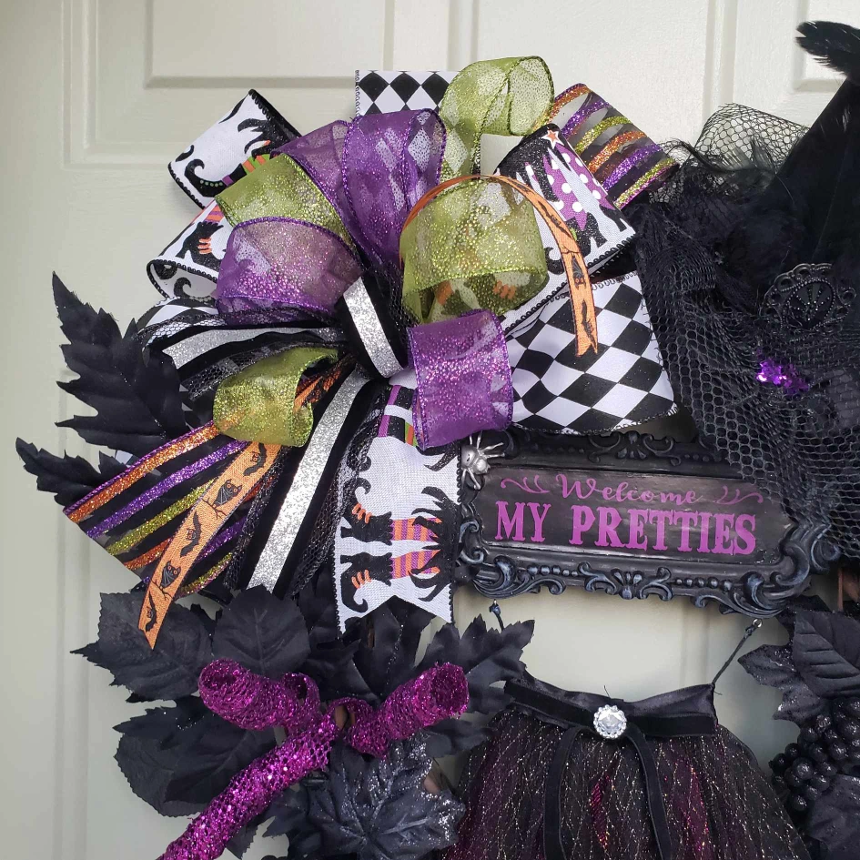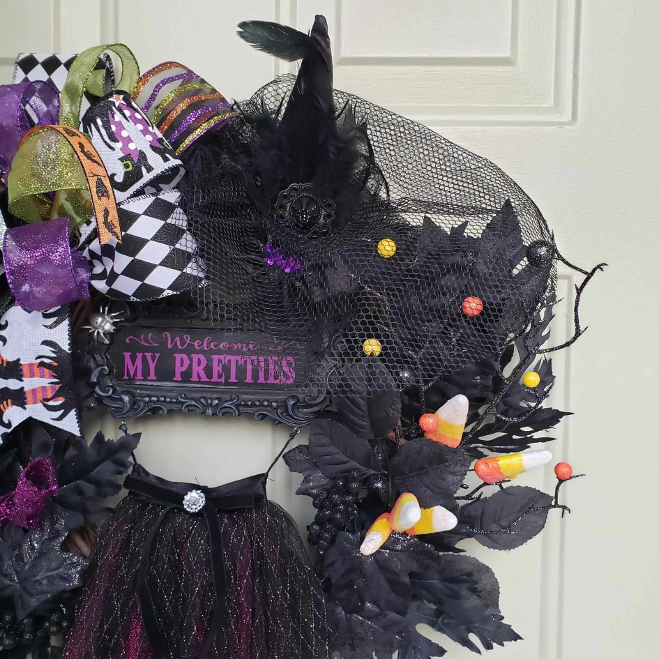 14" Grapevine wreath with decorative wood "Welcome My Pretties" sign with skirt and fabric legs. Black hat with netting, feathers and spider. Beautiful large bow. Faux black leaves and Halloween picks. All made with Michael's products except the hat. Great for indoors or outdoors in an area protected from the elements. Overall measurement is 20" x 27" Pick up near Grandview/Beatrice in Oshawa