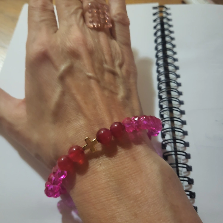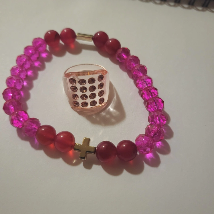 This is a large pink square ring with clear rhinestones on top. Also, a pink beaded bracelet with a gold accent cross and rectangle. Beads are stone and acrylic.