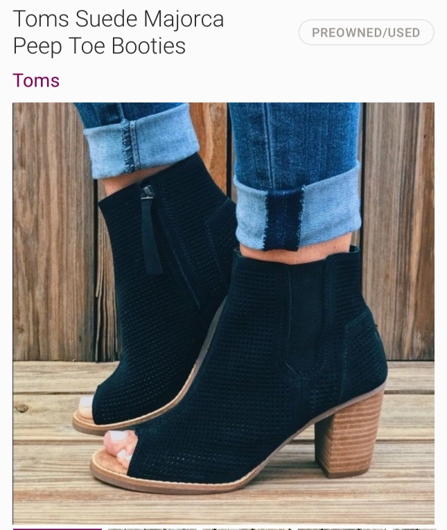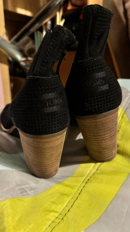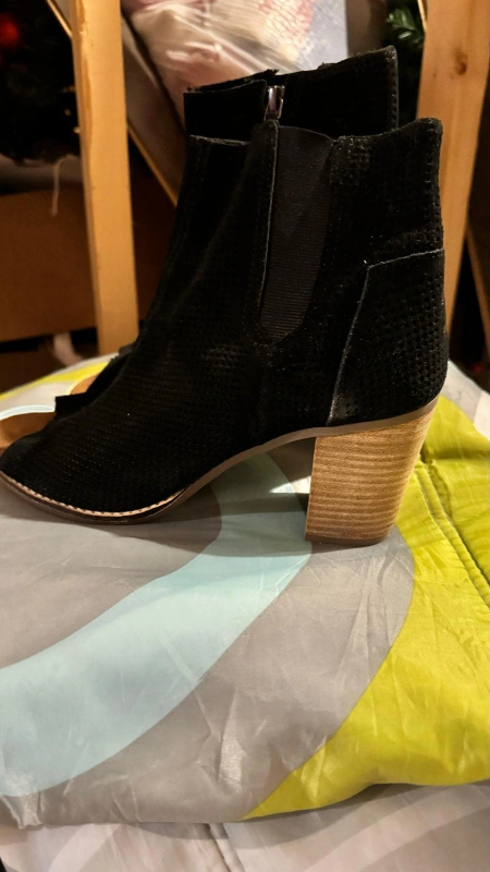 Black suede peep toe booties with a wooden heel. They have a side zipper closure.