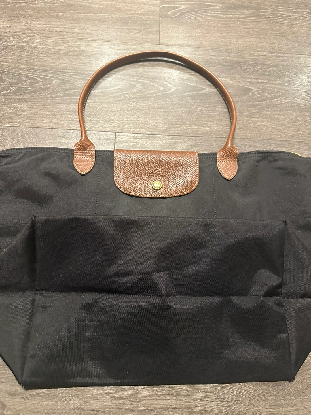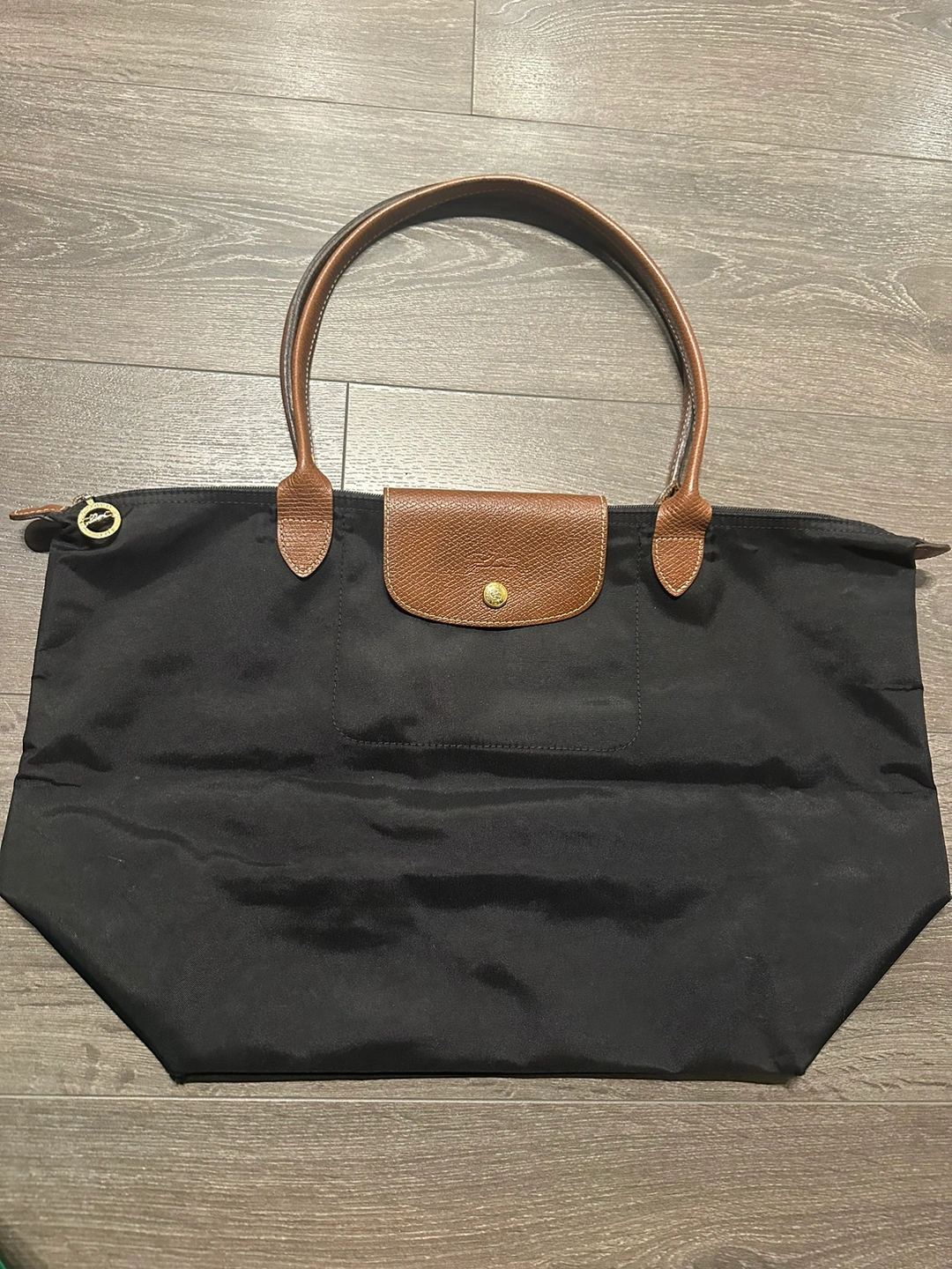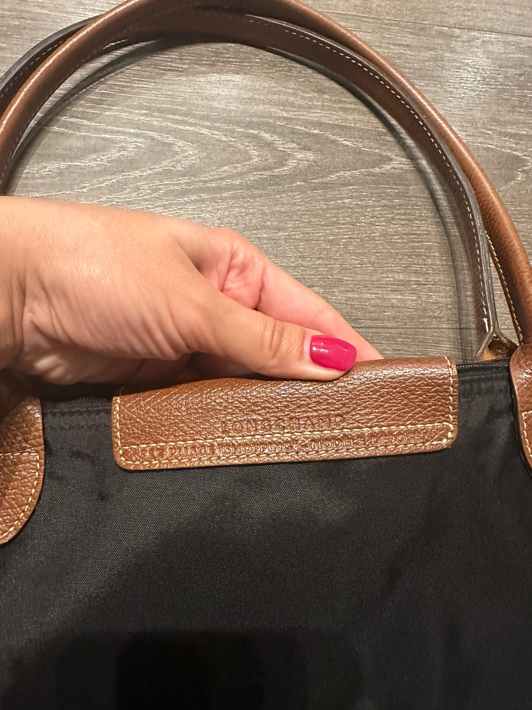 Longchamp Le Pliage Tote large Bag with brown leather handles and accents. Black colour. Good pre owned condition. Wear is shown on corners Size Width: 12'' Height: 12'' Depth: 7.5'' Handle Drop: 8'' Retails for $200 + tax