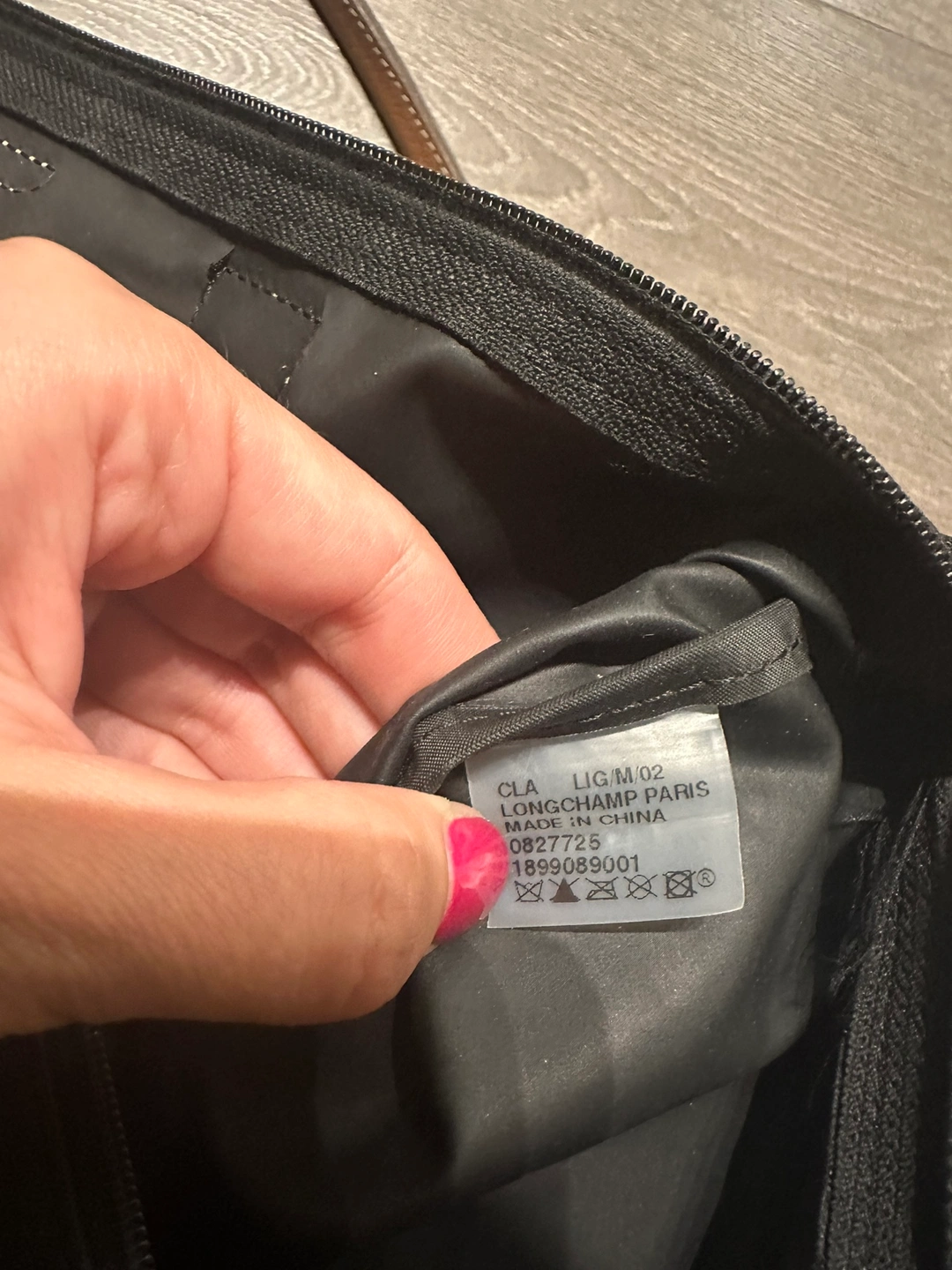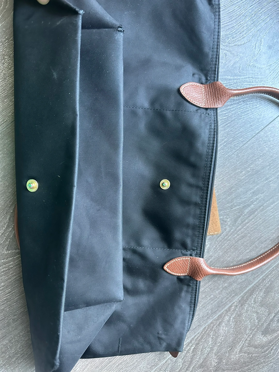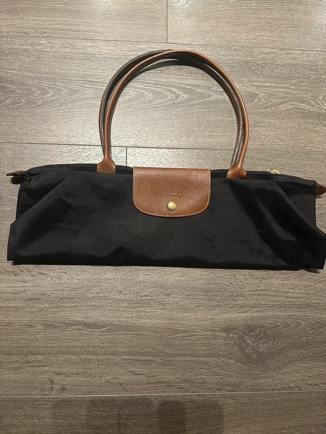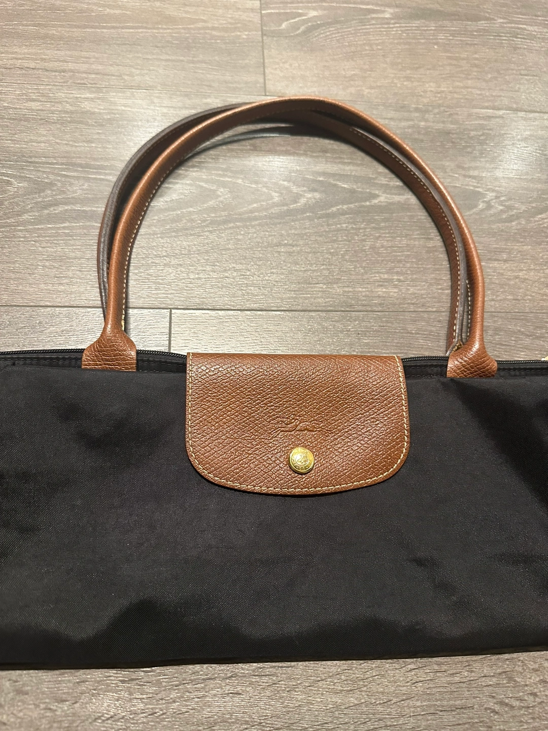 Longchamp Le Pliage Tote large Bag with brown leather handles and accents. Black colour. Good pre owned condition. Wear is shown on corners Size Width: 12'' Height: 12'' Depth: 7.5'' Handle Drop: 8'' Retails for $200 + tax