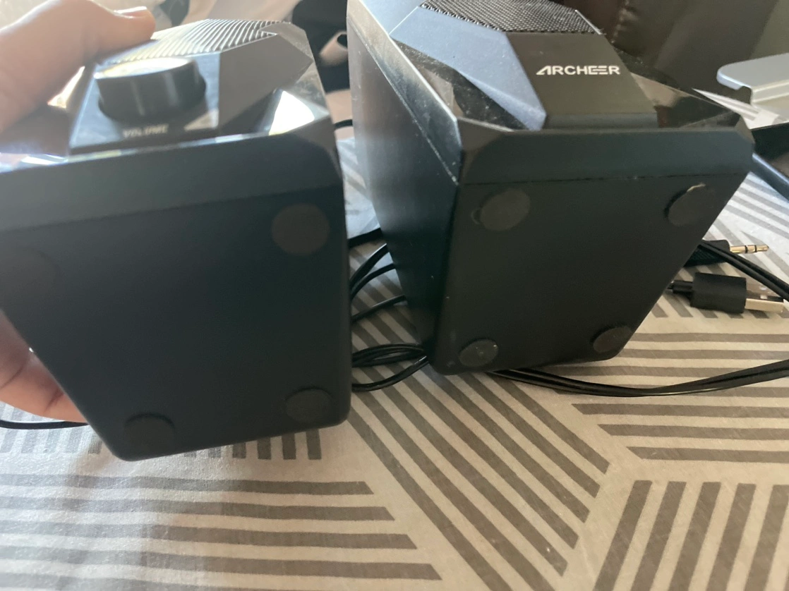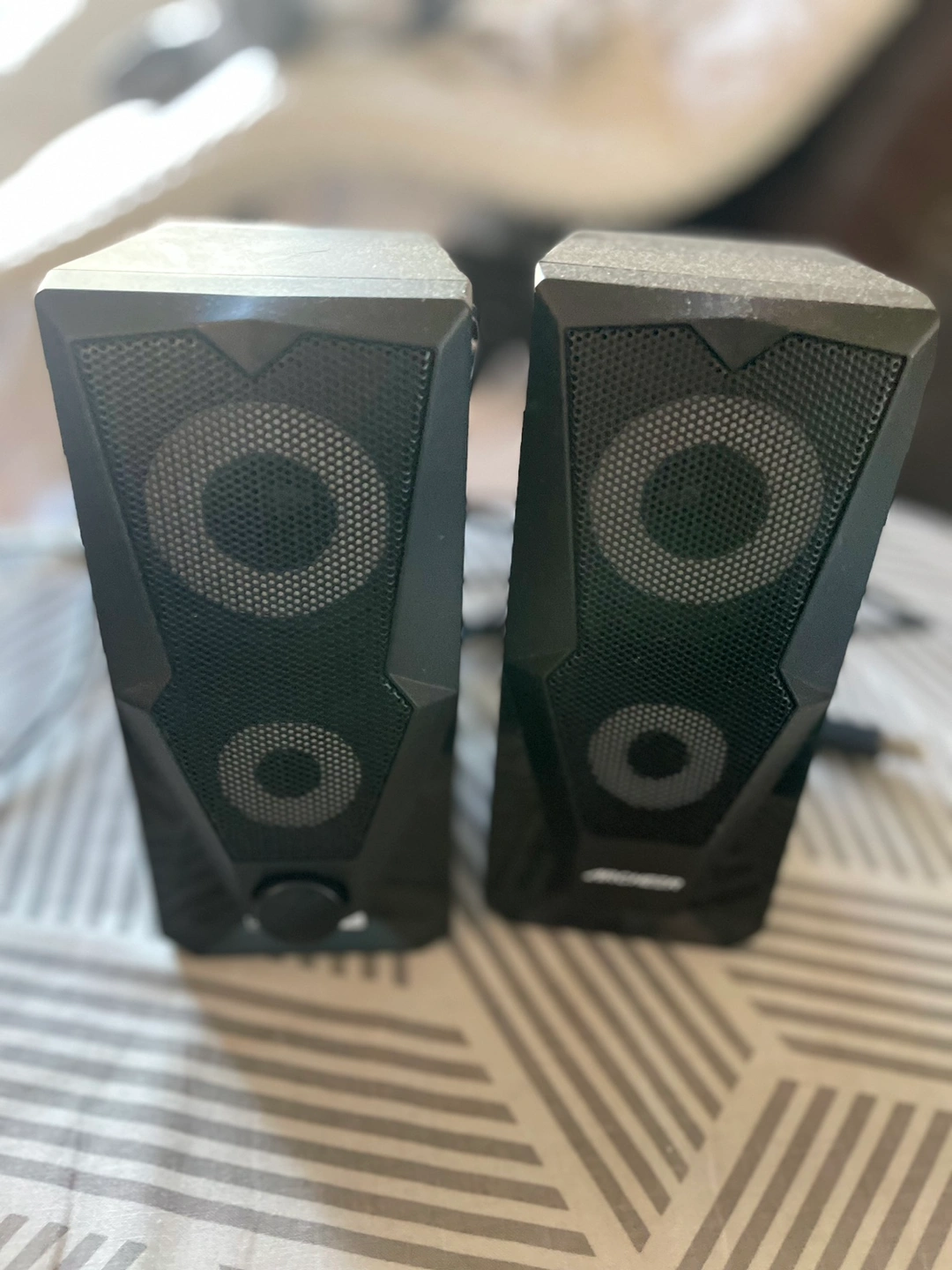 A pair of black computer speakers. They are powered by a cord with a jack for connection to a computer. They are in good condition.