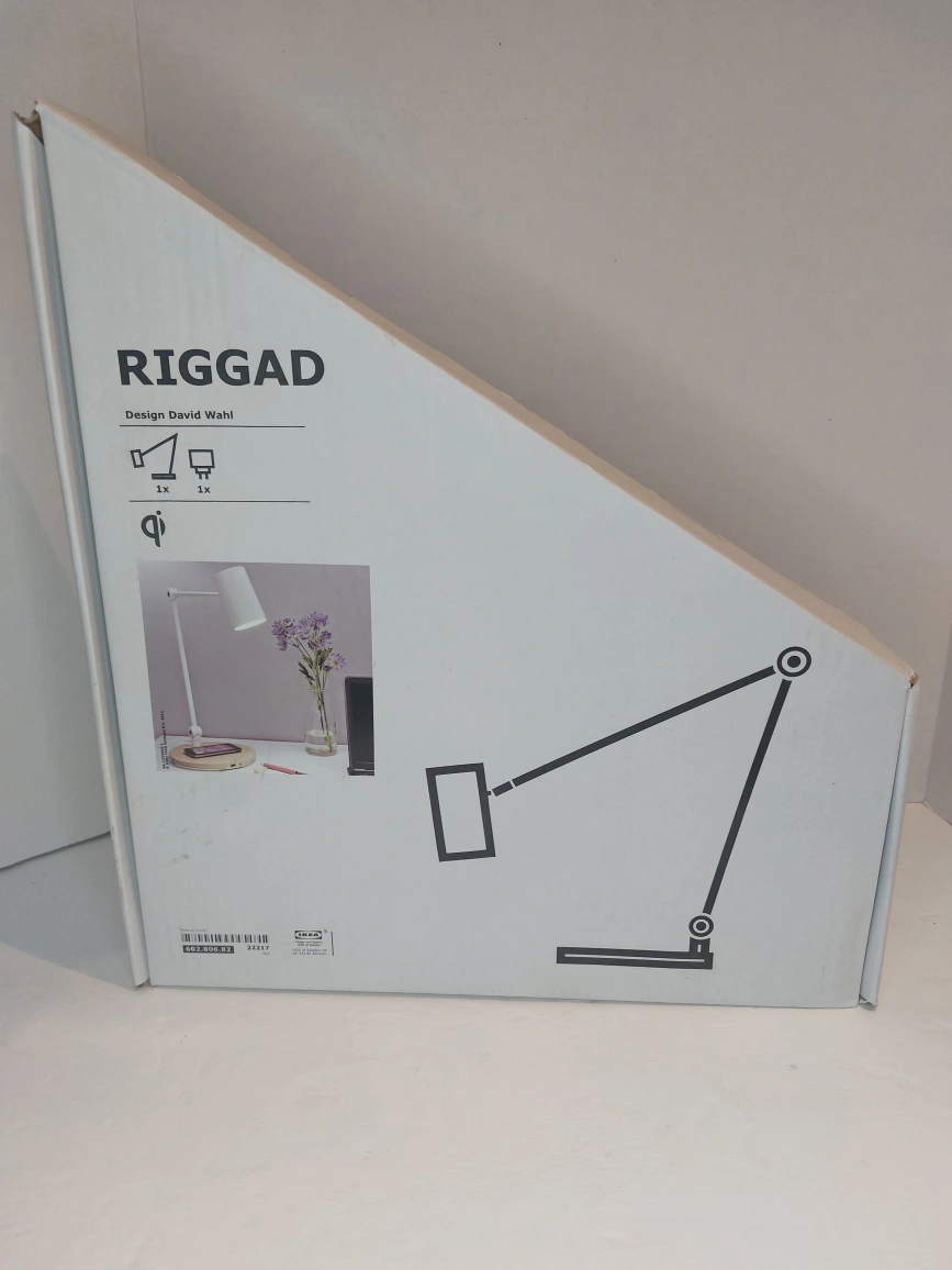IKEA RIGGAD LED work lamp wireless charging Width: 36 cm Height: 7 cm Length: 39 cm Weight: 2.31 kg New in package White desk lamp with adjustable arm and wireless charging pad on the base.
