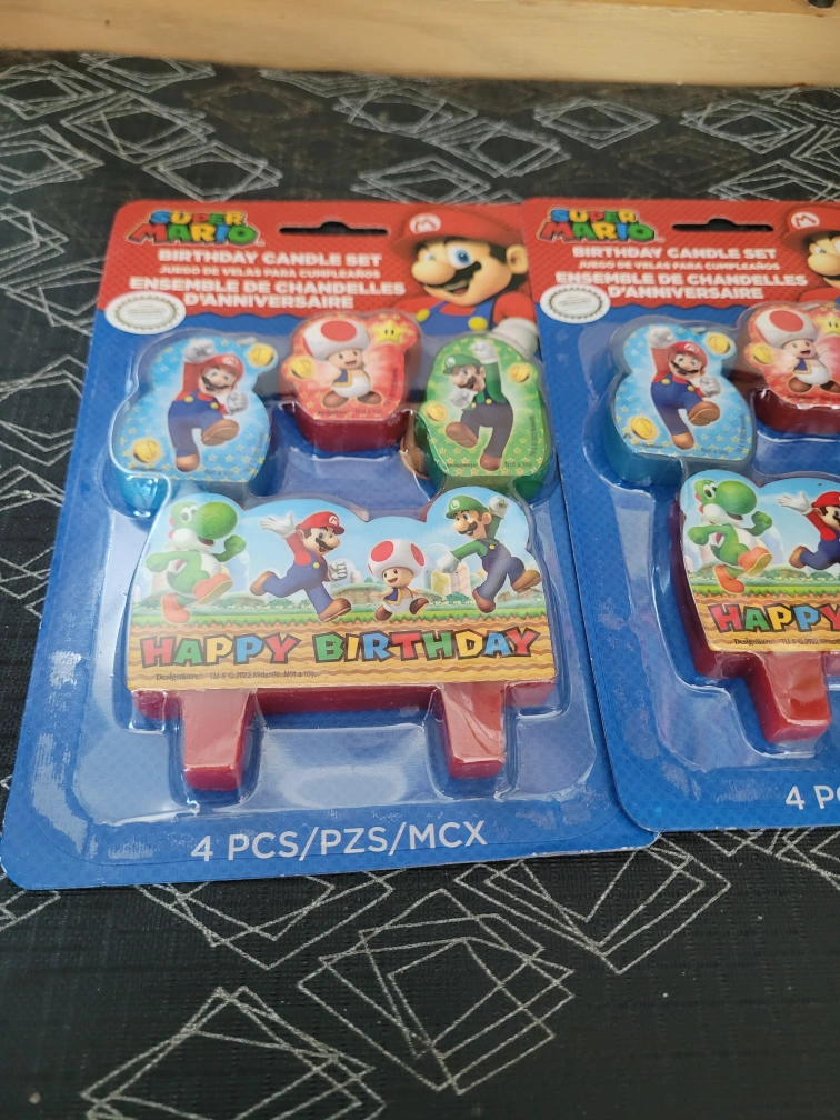 A set of Super Mario birthday candles featuring Mario Luigi Toad and Yoshi