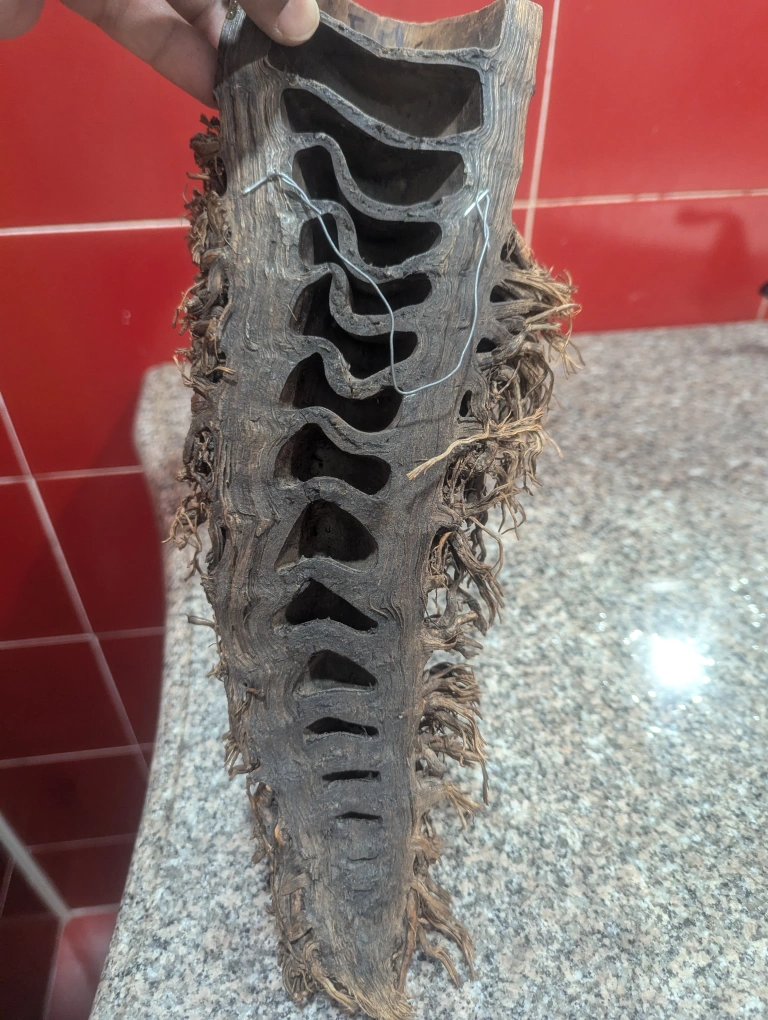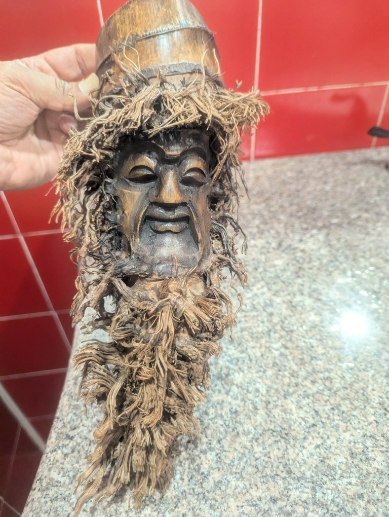 This mask was carved from the base of a bamboo tree, with the roots skillfully shaped into the beard.It hangs on the wall and measures just over 12 inches in height.
