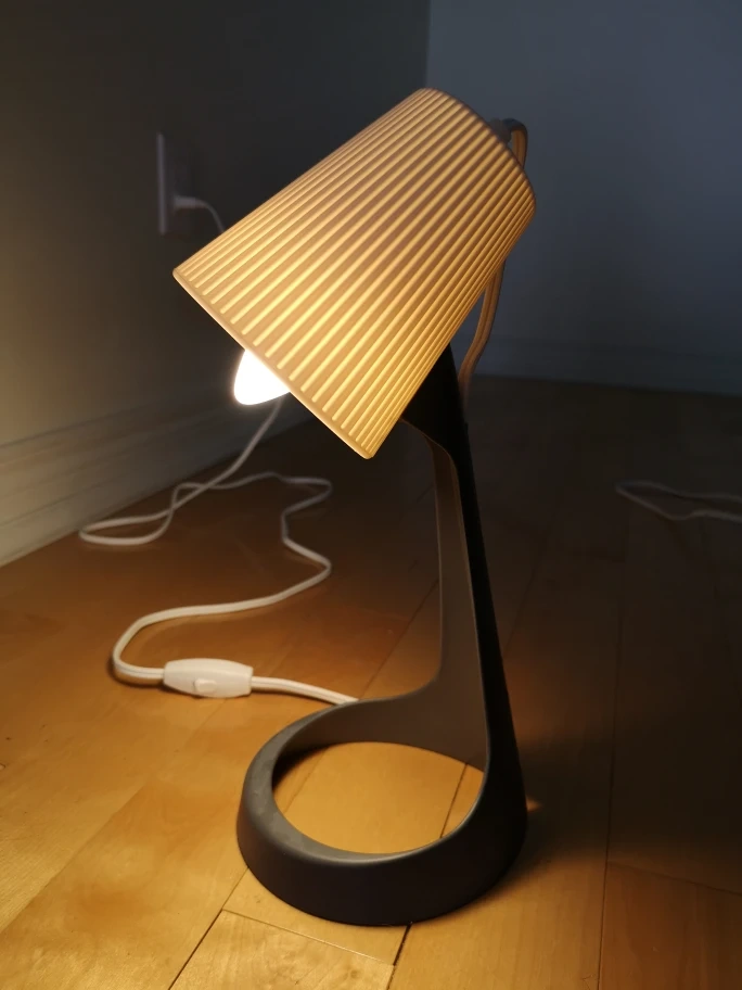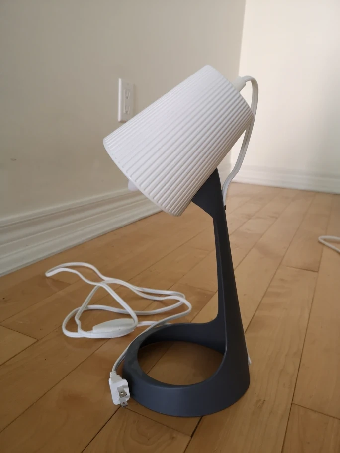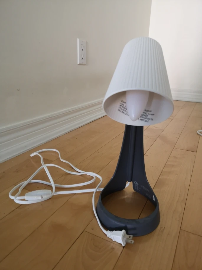 Table lamp with a grey base and white shade. It includes an inline switch on the cord. Base diameter: 16 cm (6 "), Cord length: 200 cm (6 ' 7 "), Height: 35 cm (14 "). It's in perfect condition. Light bulb included.