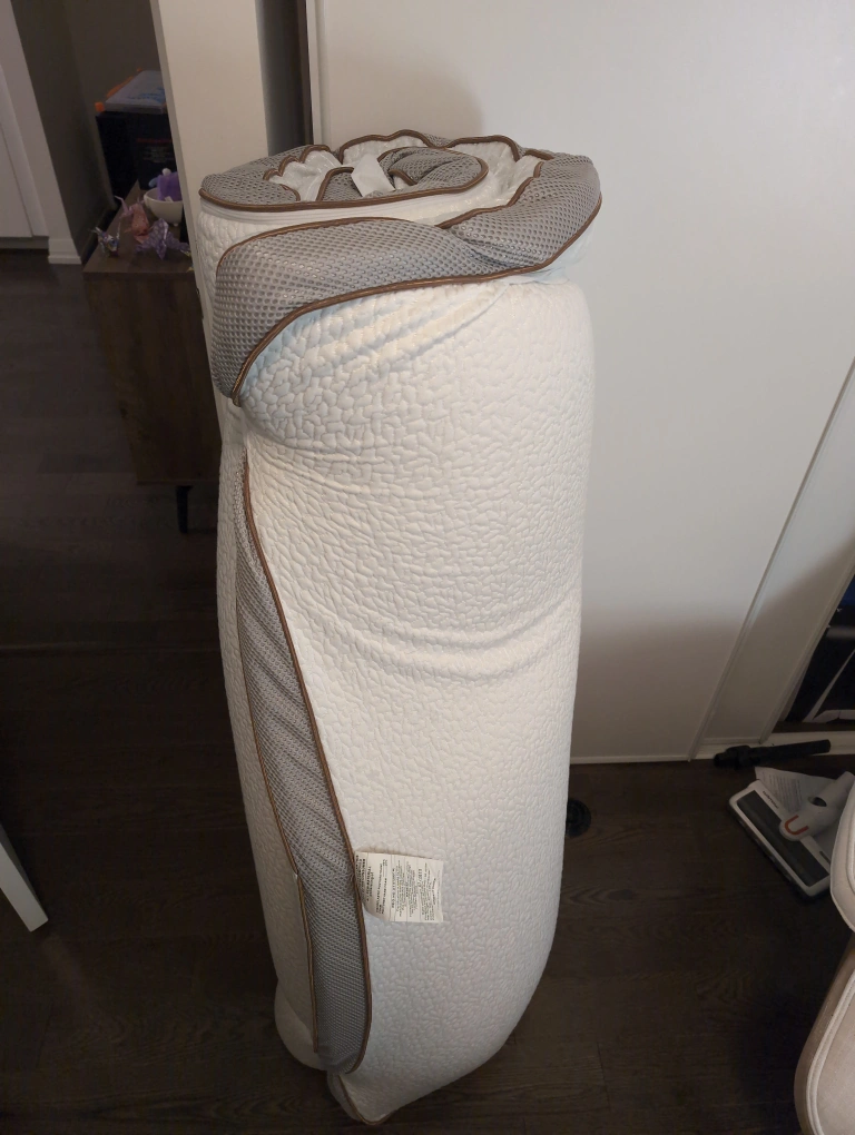 Rolled up memory foam mattress topper. Clean, has removable and washable cover, very comfy. Not a lot of use.