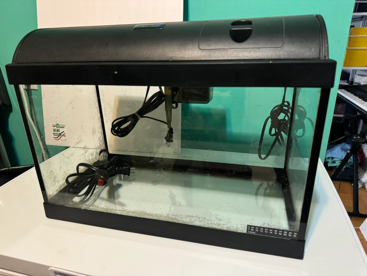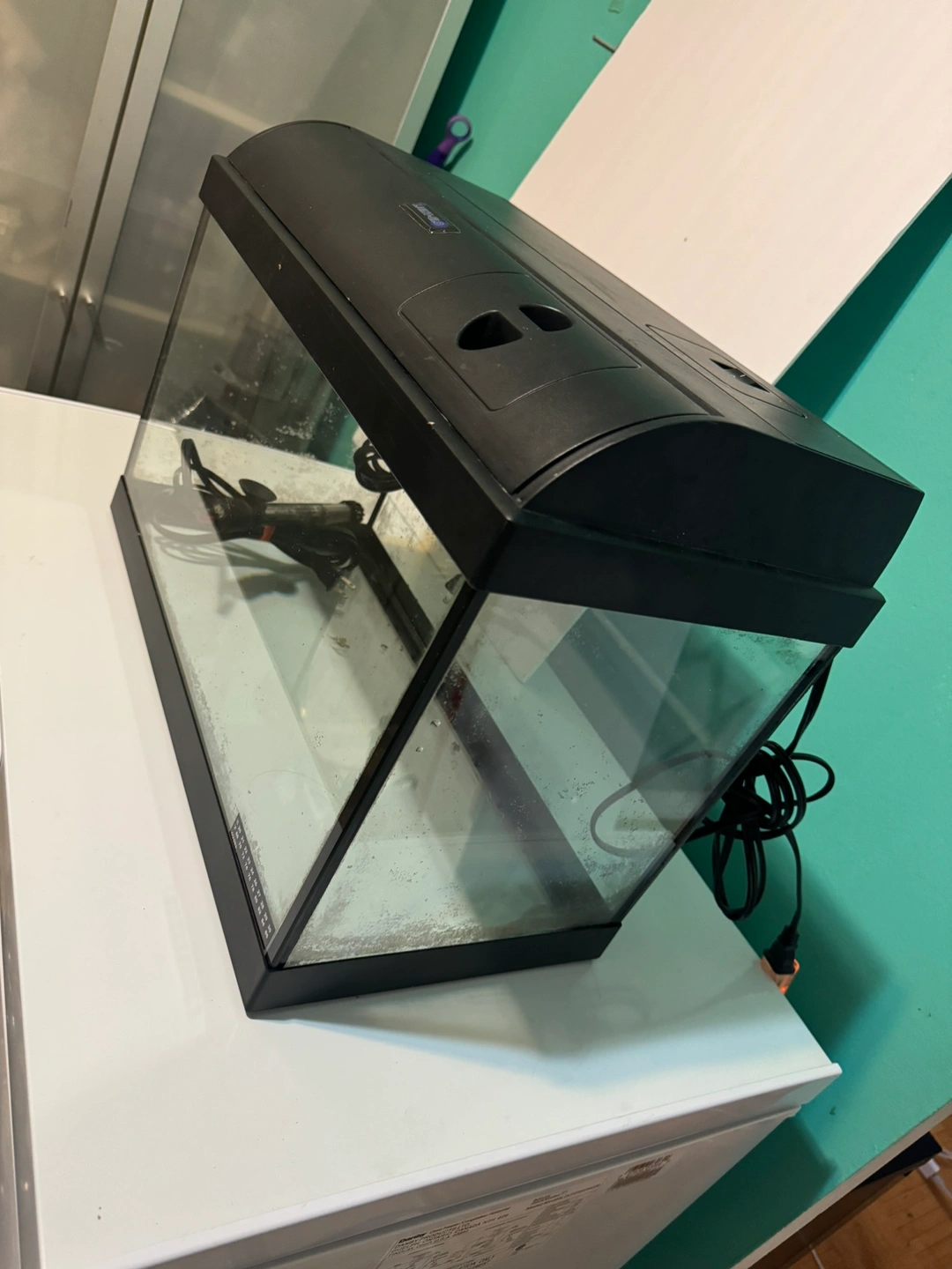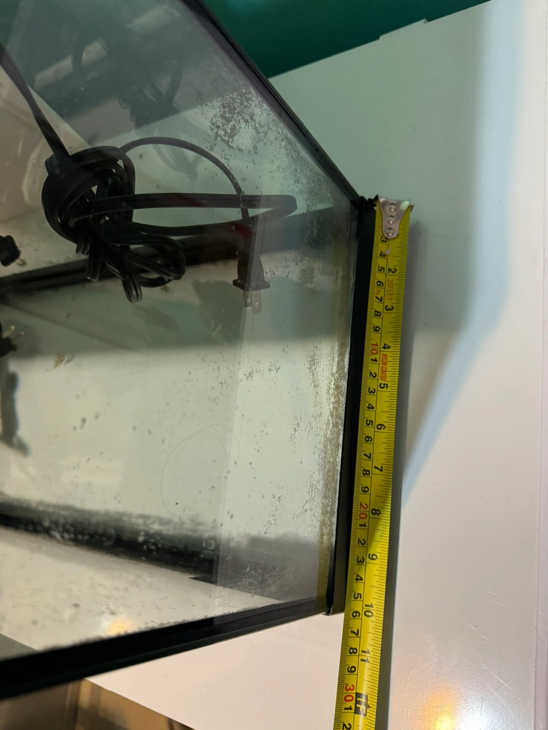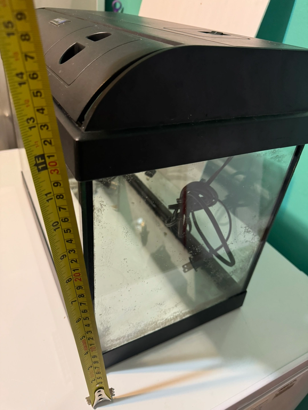 I believe This is a 10-gallon aquarium It is in good condition. There is some minor wear and tear from use. The light and filter and heater are in working condition.