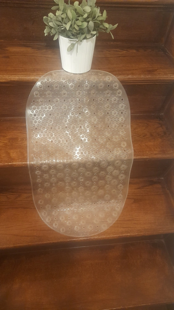 Clear bath mat with small drainage holes. Good for use in the bathtub or shower.