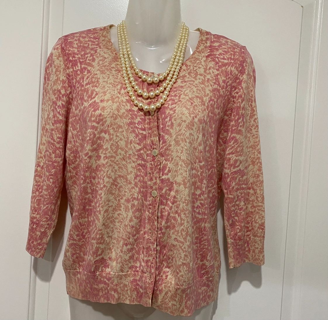 A pink and beige cardigan sweater with an abstract print. The sweater has long sleeves and a button closure. Pick up @ 34th E Ave & Victoria Drive, Vancouver *necklace is not included* ***Please check out my other ads too, if you buy a few, I can give you a deal***