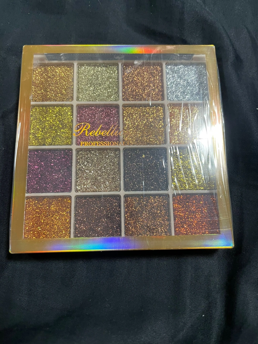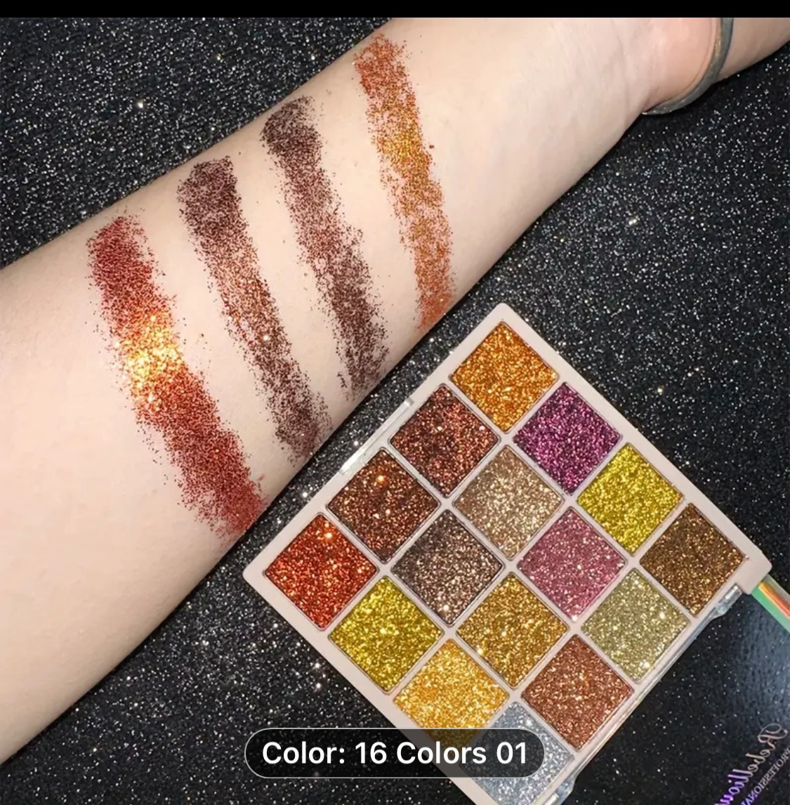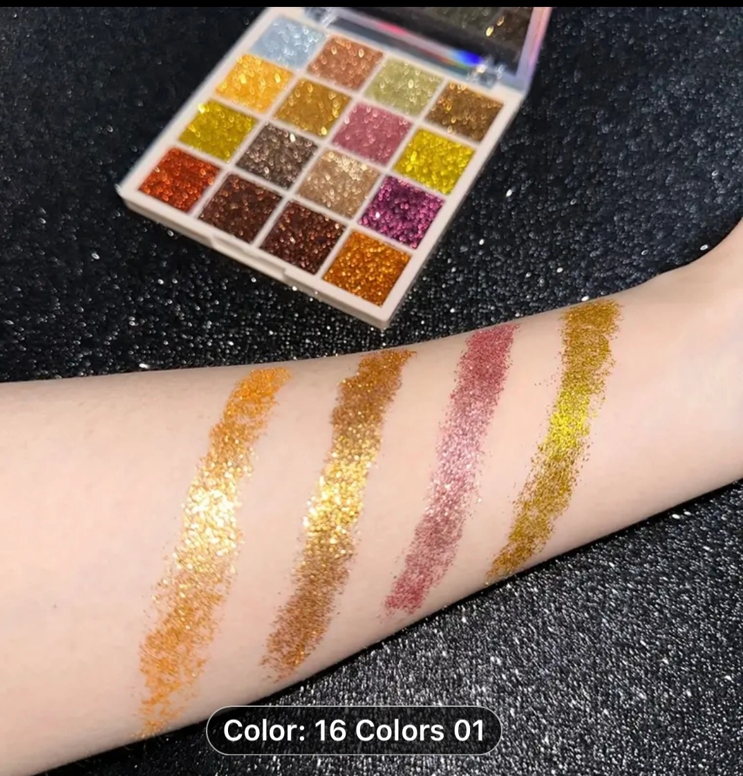 This is a 16 colour glitter eyeshadow palette. It has a variety of gold, bronze, pink and copper colours in a mix of shimmer and glitter finishes. Perfect for a bold look!