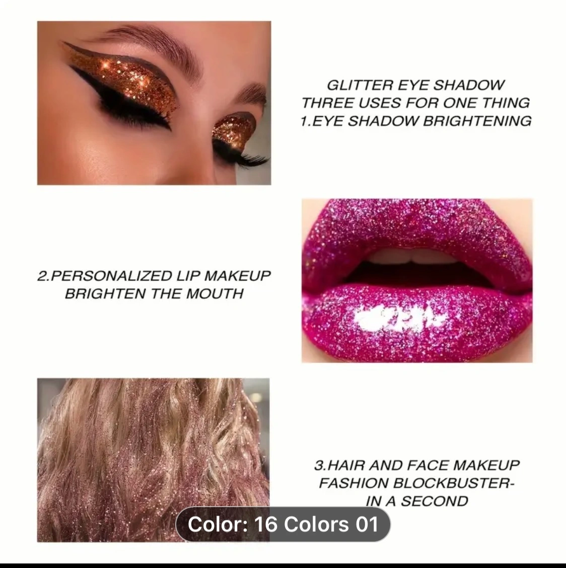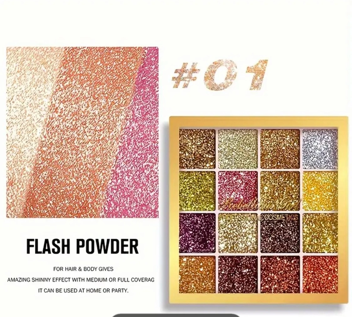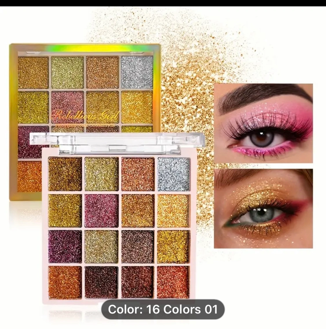 This is a 16 colour glitter eyeshadow palette. It has a variety of gold, bronze, pink and copper colours in a mix of shimmer and glitter finishes. Perfect for a bold look!