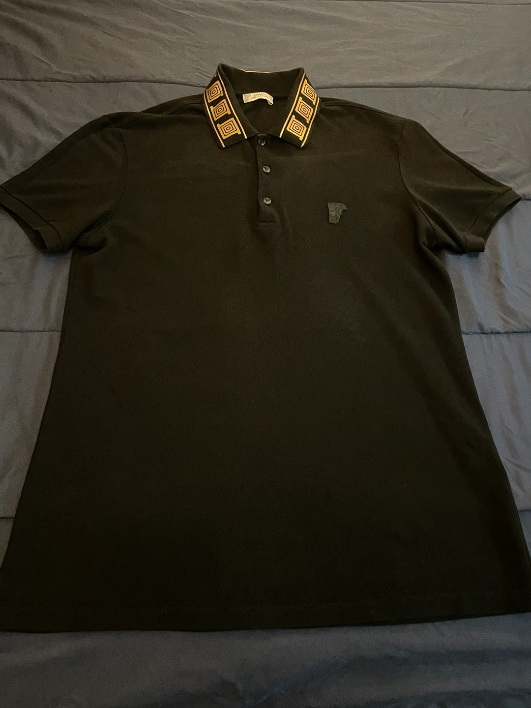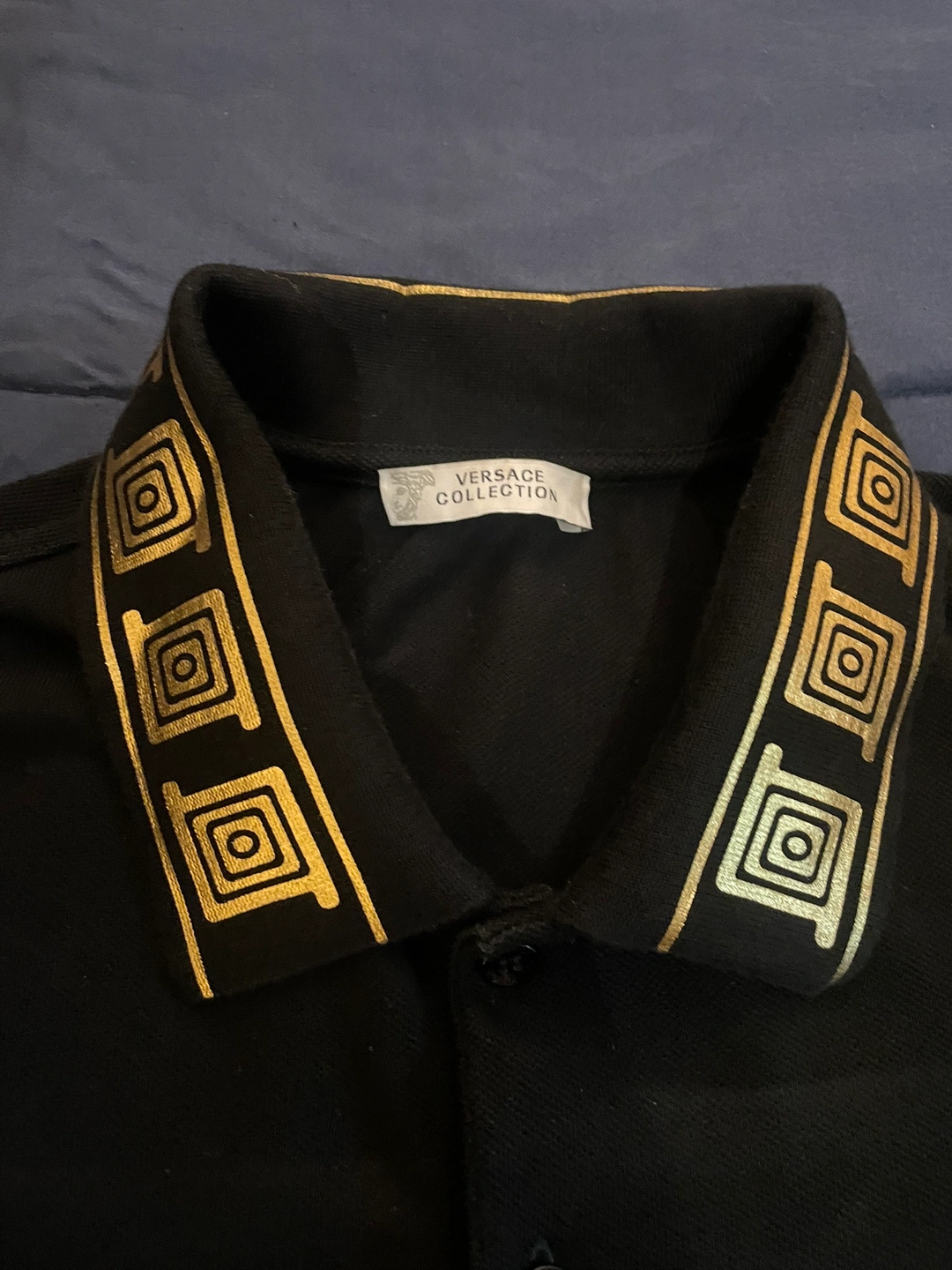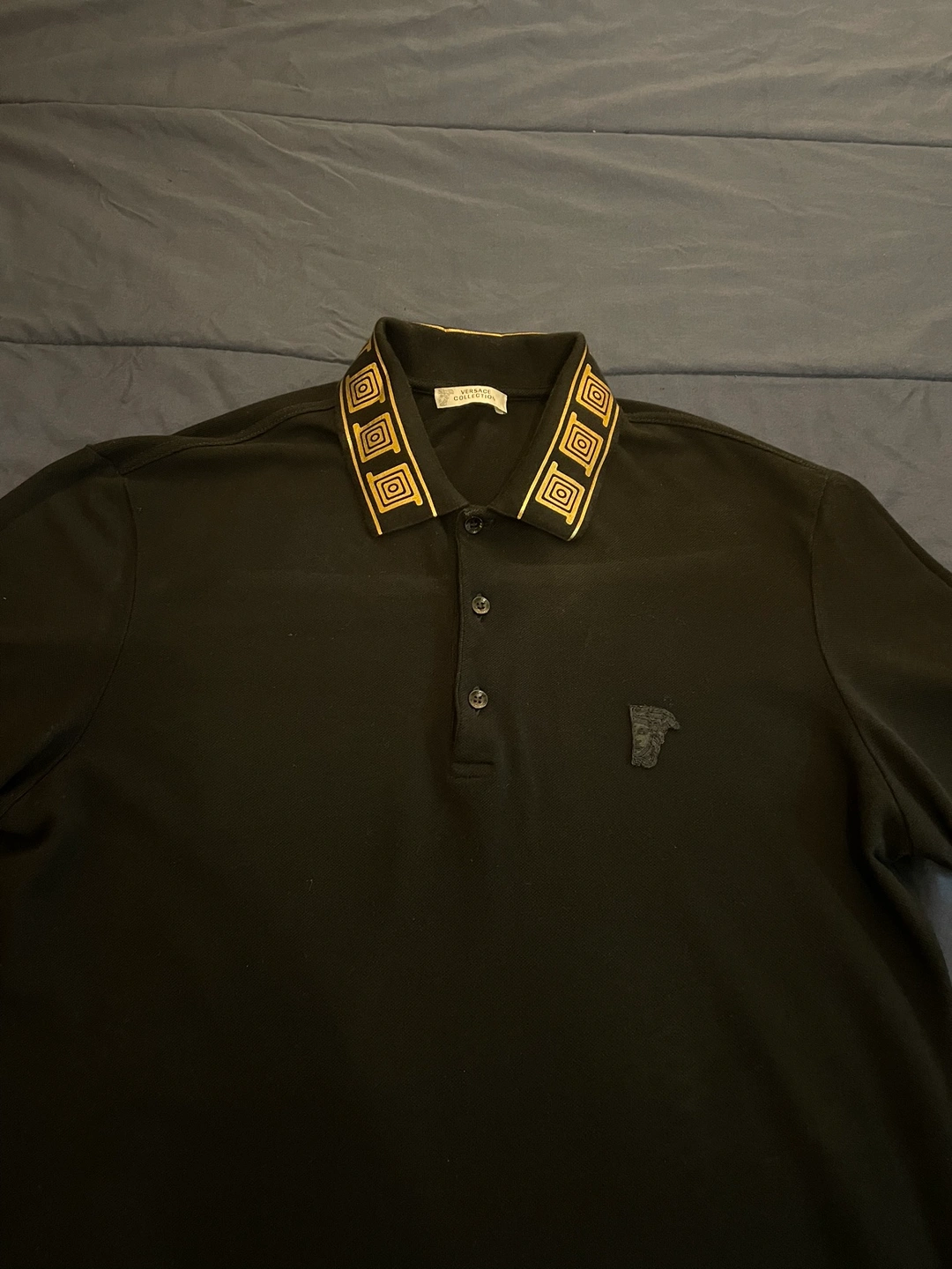 Black polo shirt with a gold patterned collar. The shirt has a small Versace logo on the left side of the chest. The shirt is short-sleeved and has a button closure. The size is a large. The shirt is made of cotton. Condition: Previously worn 100% Authentic ✔️