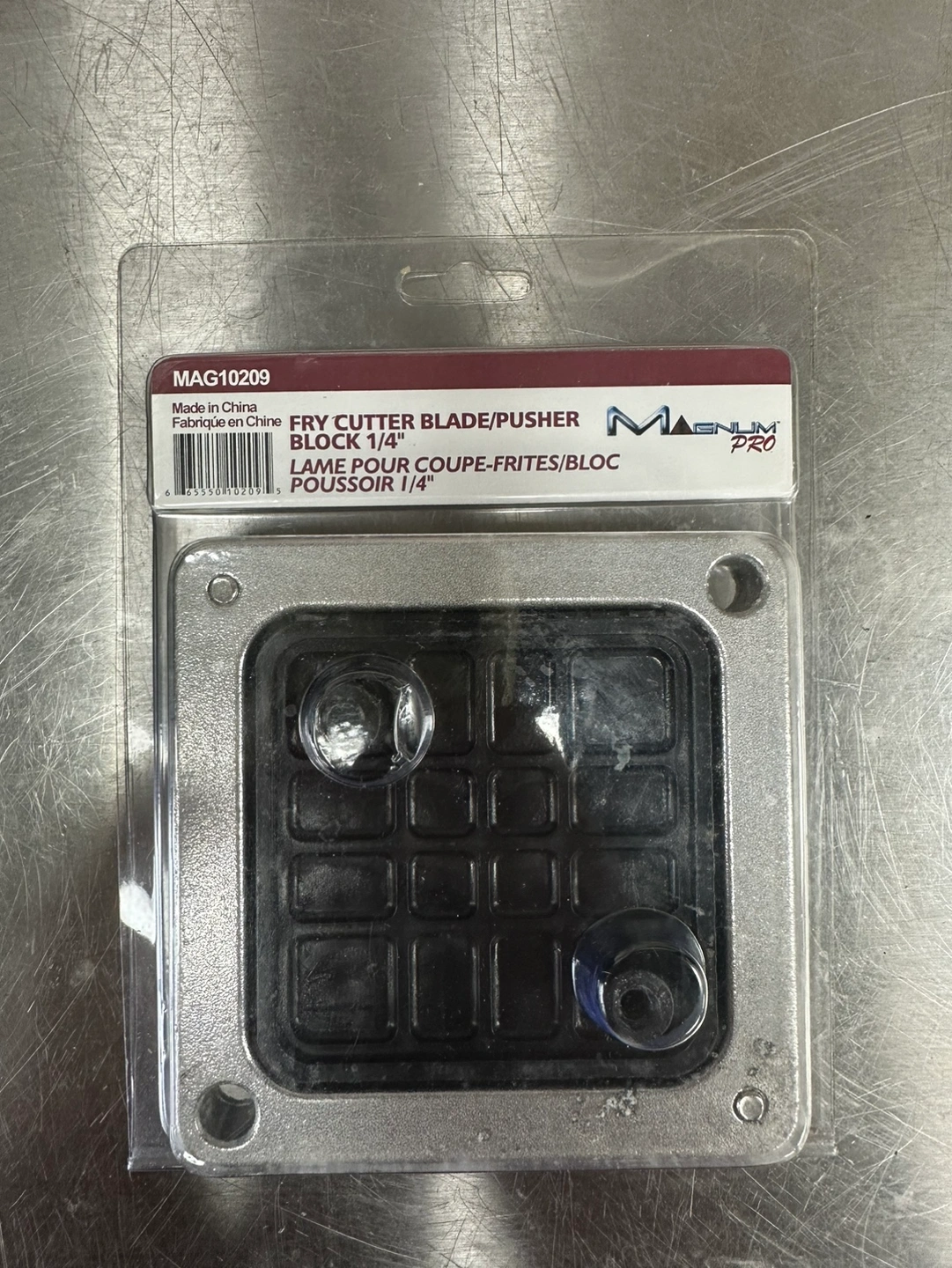 A fry cutter blade and pusher block. Includes 1/4" blade. Comes with a metal holder.