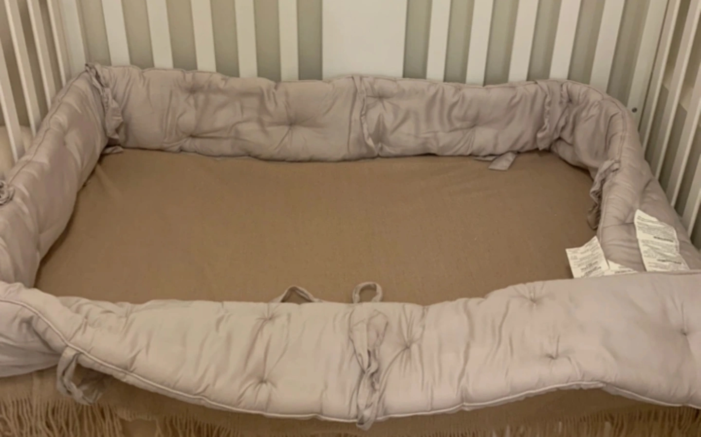 Light mauve crib bumper with ties for standard-size crib. It’s reversible with a slightly different design on each side, and machine washable. Item purchased in 2021 at Pottery Barn Kids. My baby did not sleep in her crib so it was simply decorative. The measurements are: 160 inches by 9 3/4 inches.