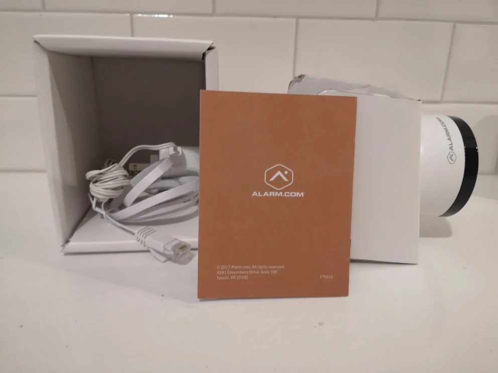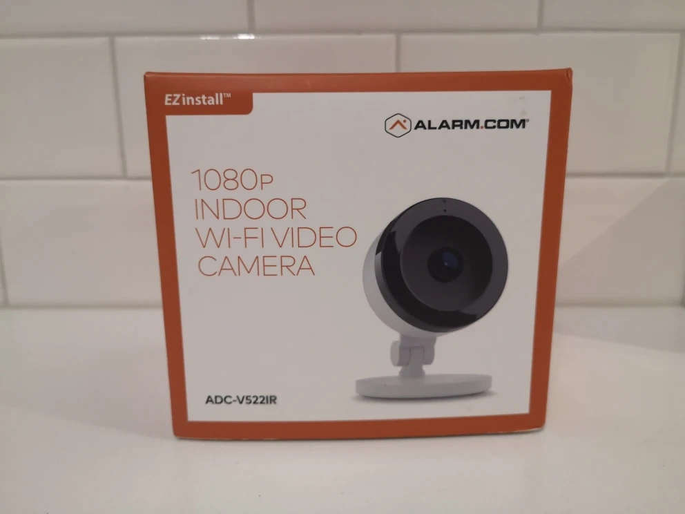 Alarm.com indoor video camera. It comes with everything you need to set it up, including a power adapter, a USB cable, and a quick start guide. It is packaged in its original box. It has a 1080p resolution, a 113 degree viewing angle, and night vision. It is compatible with 2.4 and 5 GHz Wi-Fi networks. It can also be used with a wired connection. It has a variety of features, such as image adjustments, a motion detector, and two-way audio. It can be used for security purposes or to keep an eye on your home when you are away. **for use with Alarm.com service**