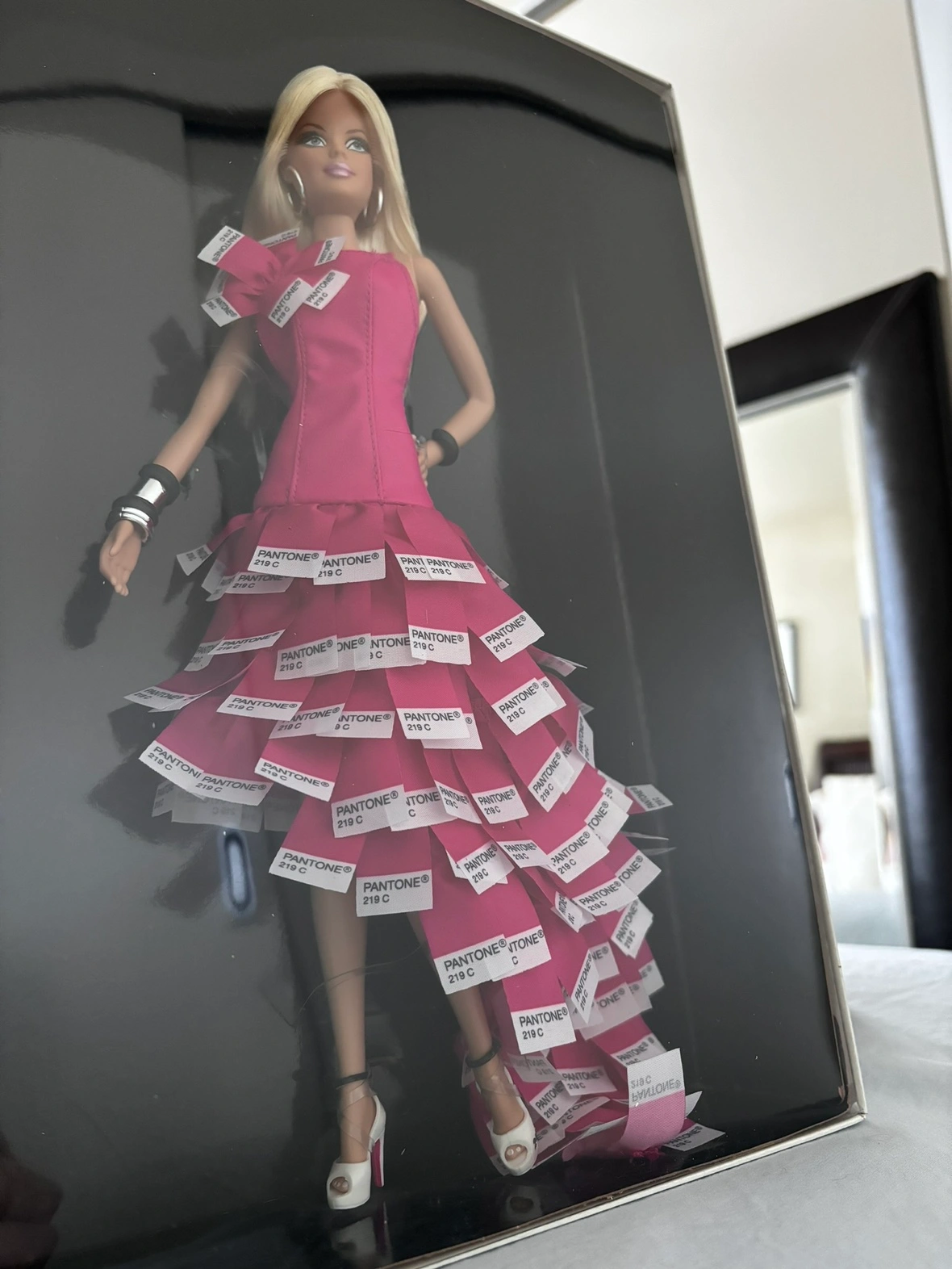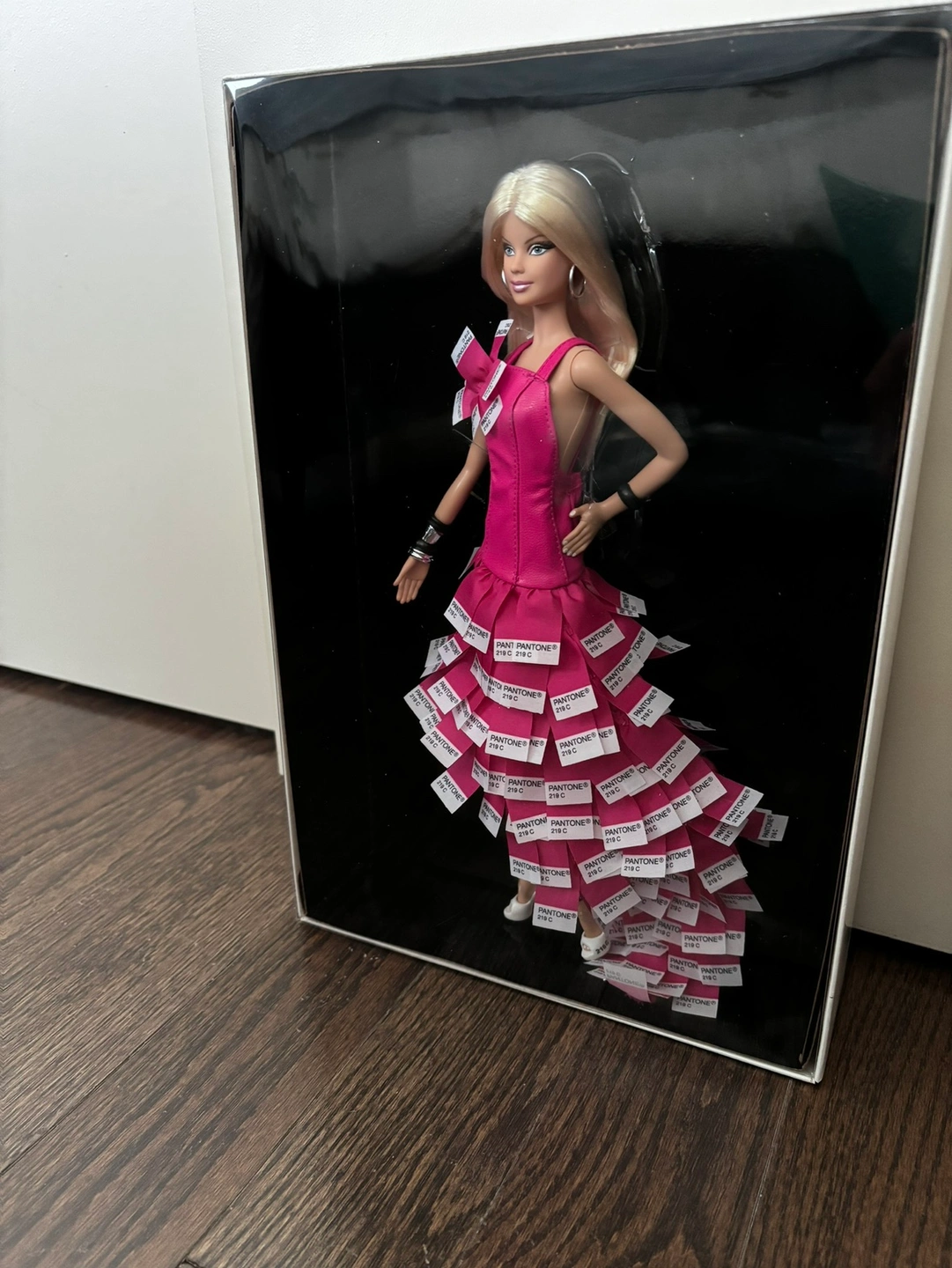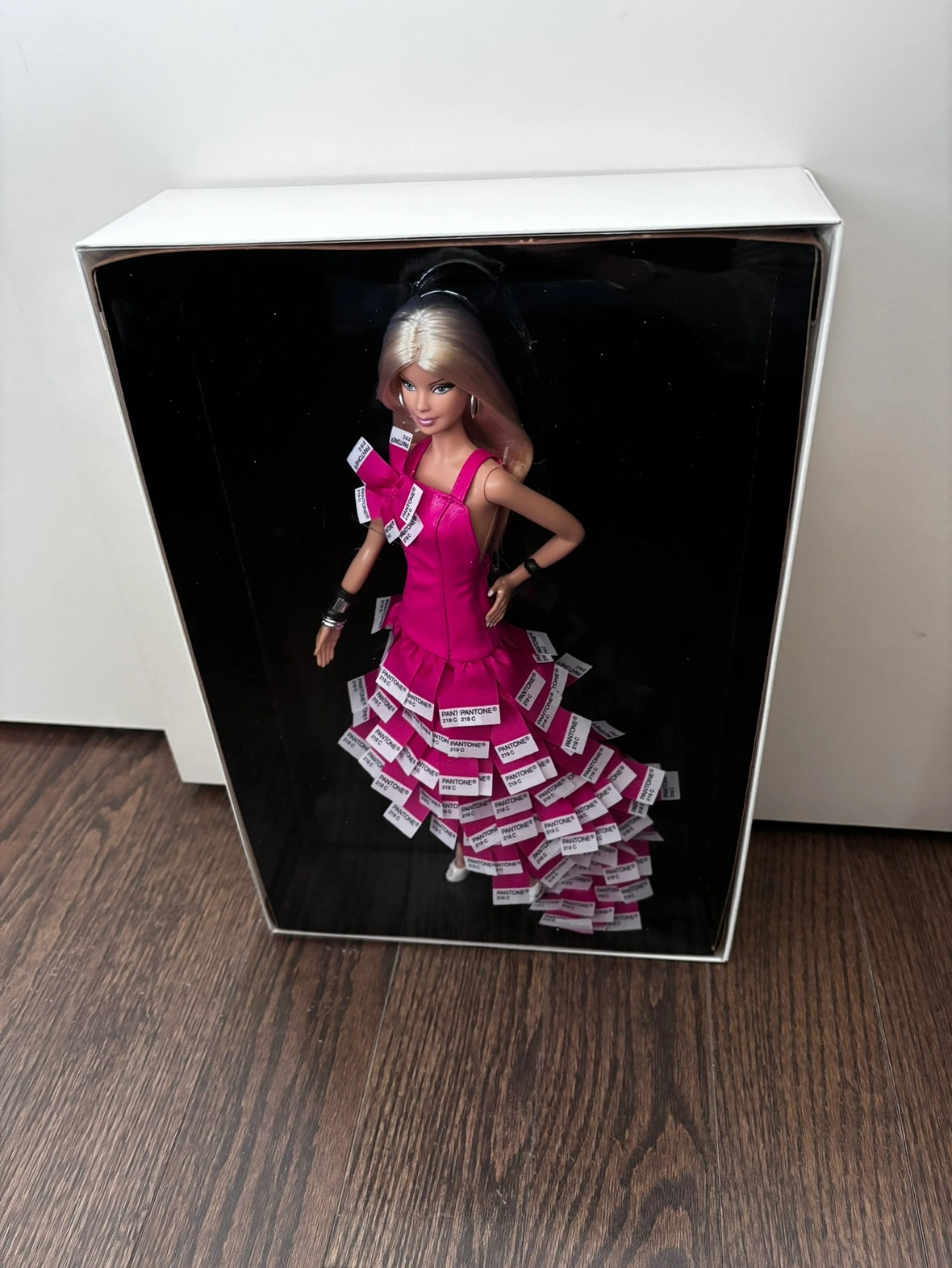 With her playful eye for fantastic fashion, Barbie® doll wears a unique gown inspired by PANTONE® Color Chips in her own signature color! Her white peep toe pumps have soles that are painted PANTONE 219 C. Platinum blonde hair and black and silvery bangles complete this quintessential Barbie look. New in the box. Was never removed, for more information please see photos. Comes from non smoking household. Gold label limited edition. Only 15100 were made worldwide. Selling on multiple platforms.