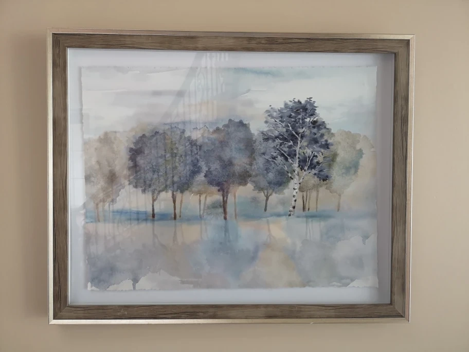 A framed print of a watercolor painting of trees and a reflective pond. The painting is in a light wood frame. The frame is in good condition. Size: 30.3" x 24.3"
