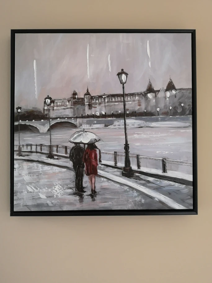 A framed printed canvas of a painting depicting a couple walking under an umbrella in a city setting. The painting is done in shades of grey and white with a touch of red in the woman's coat. Size: 19" x 19"