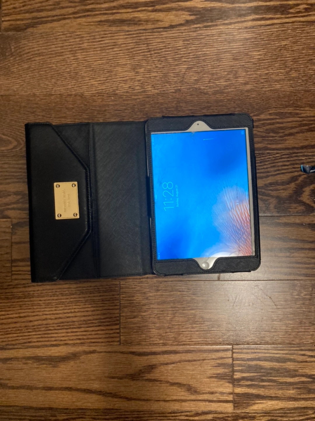 Michael Kors leather case is like new. iPad mini 1 works perfectly with long lasting battery, the surface is well used with scratches and cracked screen (covered with a protective film). The case originally paid over $140 +tax, both for $90.
