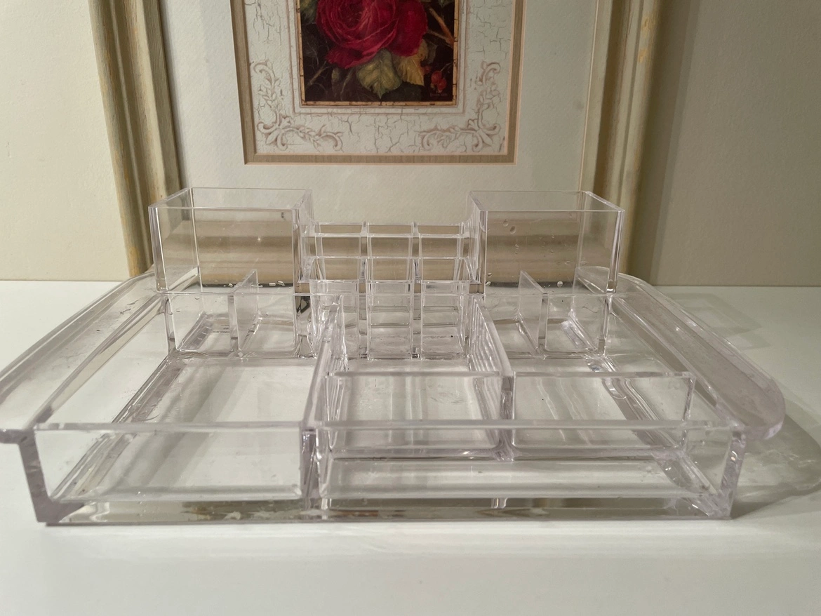 Clear acrylic makeup organizer with several compartments for storing makeup brushes, palettes, and other items. It has a large tray on the bottom, with multiple smaller compartments, and two tall compartments on each side of the centre piece. Just needs some cleaning