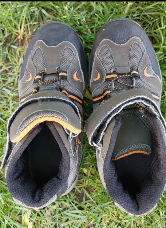 These shoes are grey with orange accents. They have a velcro strap and a lace-up closure.Size 1 kids, pick up Victoria Park and St. Clair. Cross-posted