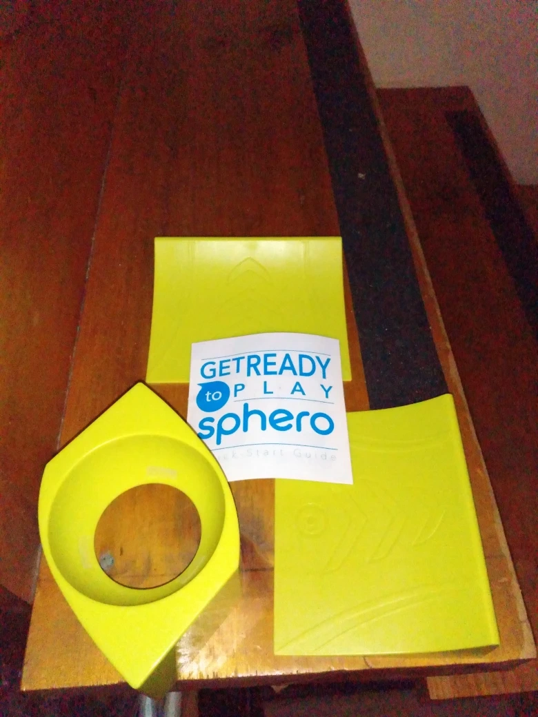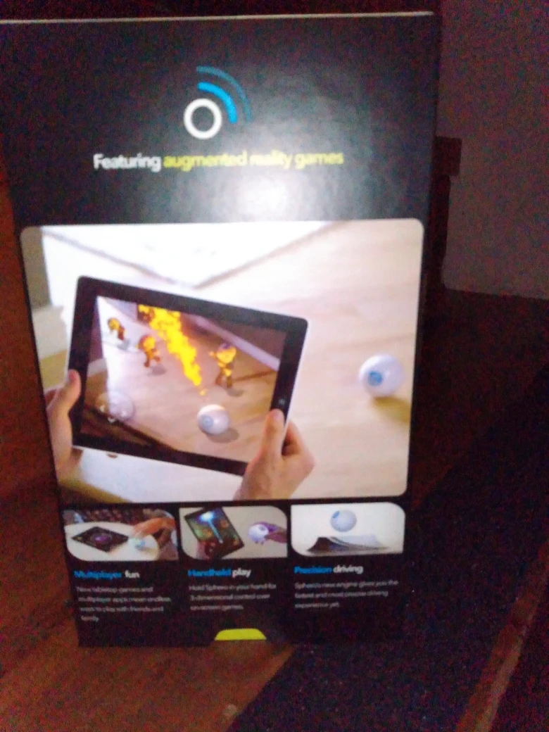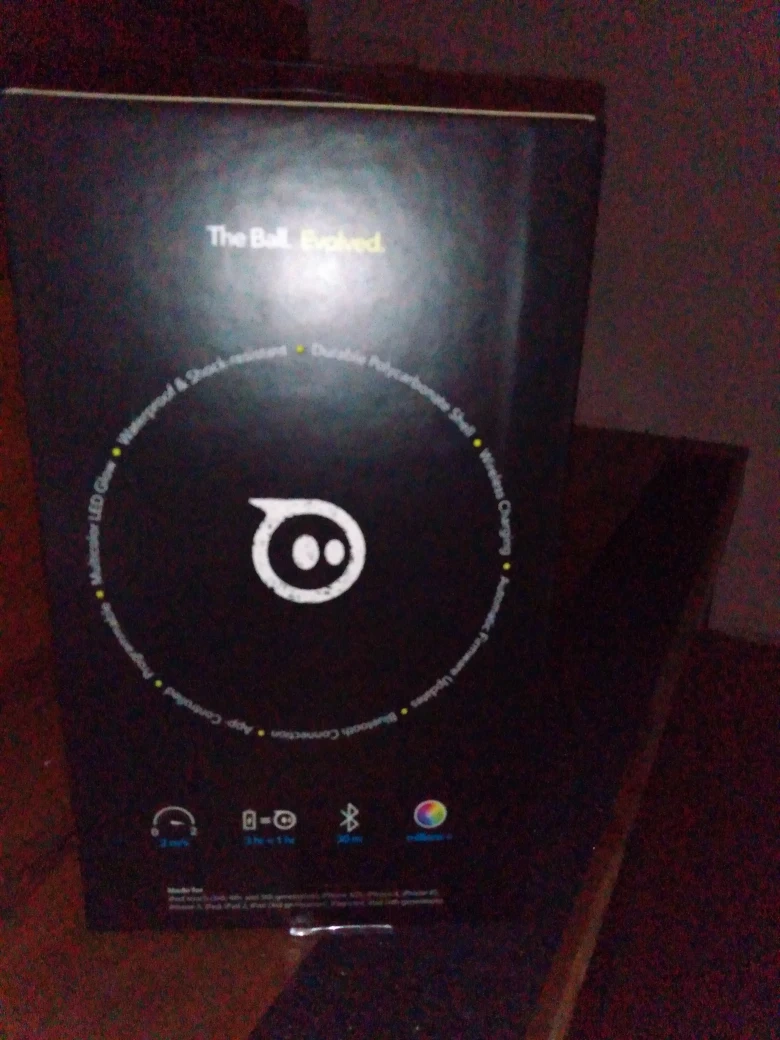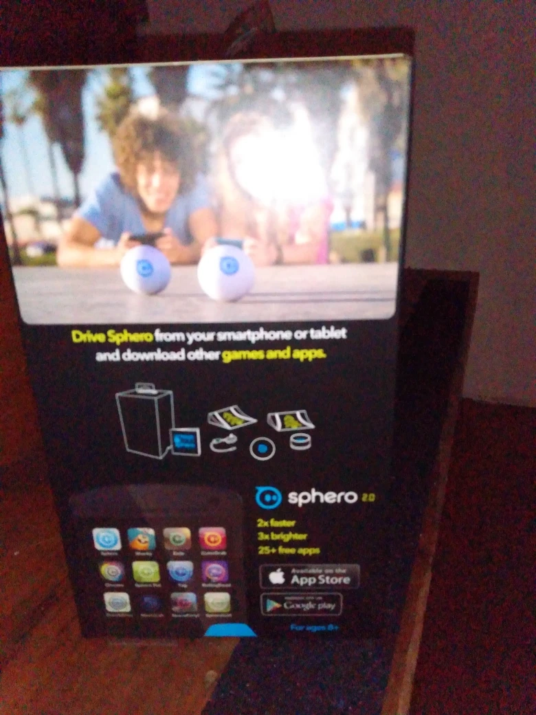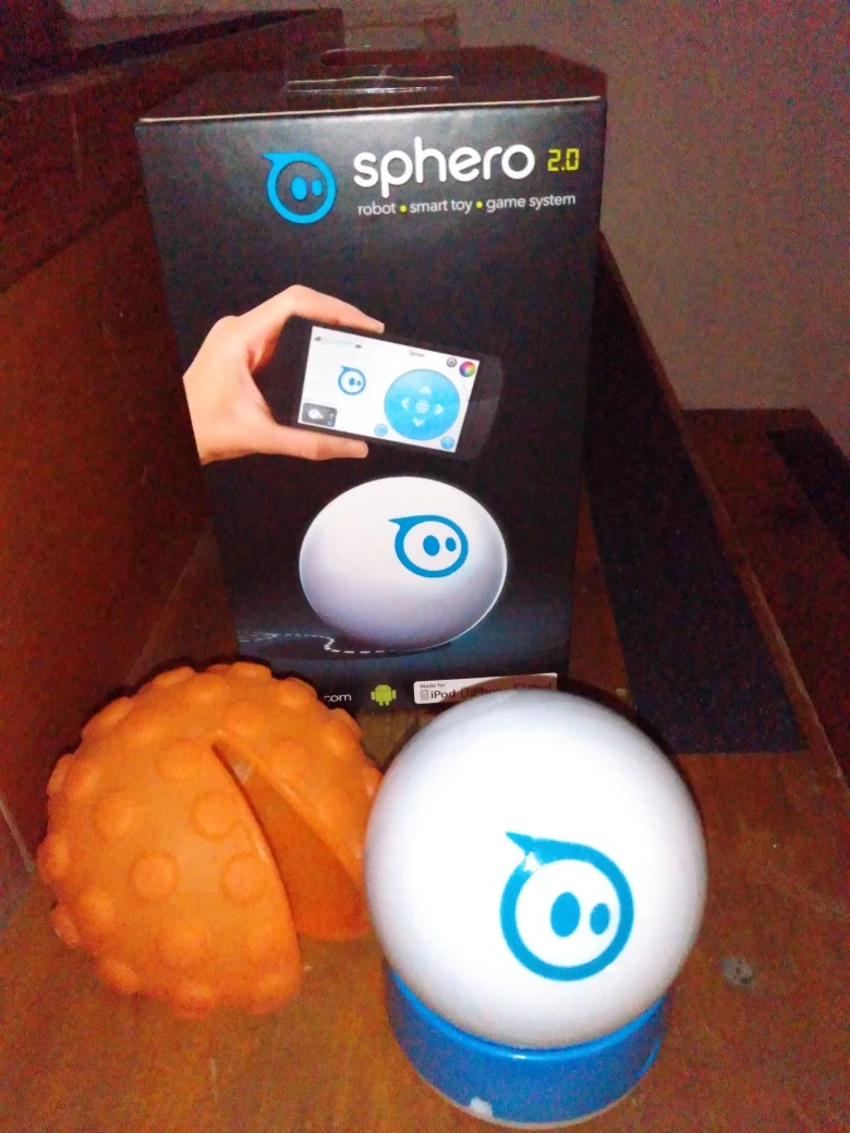 This is a Sphero 2.0 robot ball. It comes in the original box with all of its accessories. The ball is white and blue.