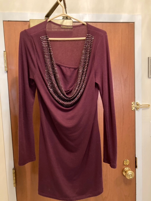 This is a beautiful, burgundy, long-sleeved dress with a cowl neckline. It is adorned with silver stones. The dress is a size Medium. It is made of a soft, stretchy material. Can be used as mini dress or a tunic