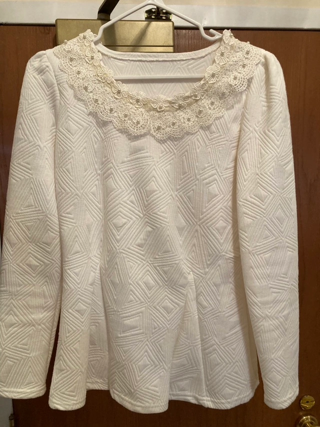 White long sleeve tailored top with a lace and pearls trim around the neckline and shoulders. The fabric has a geometric pattern.