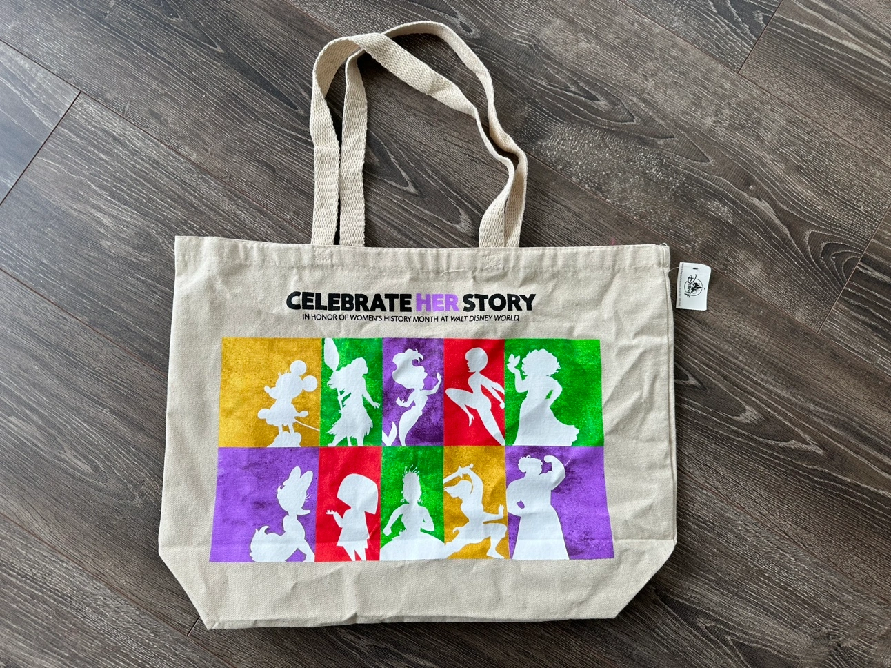 A beige canvas tote bag with the words "Celebrate Her Story" and an image of several female Disney characters in silhouette. It says "In Honour of Women's History Month at Walt Disney World". It has long cotton straps and a Disney World tag.