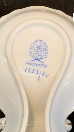 A beautiful porcelain dish perfect for serving condiments or snacks or salt and pepper. The dish features a hand-painted rare Rothschild design with two separate serving areas connected by a handle. A gold trim details the scalloped edges and the handle. This is a beautiful and unique piece of tableware that would make a wonderful addition to any collection. No damage scratches chips.