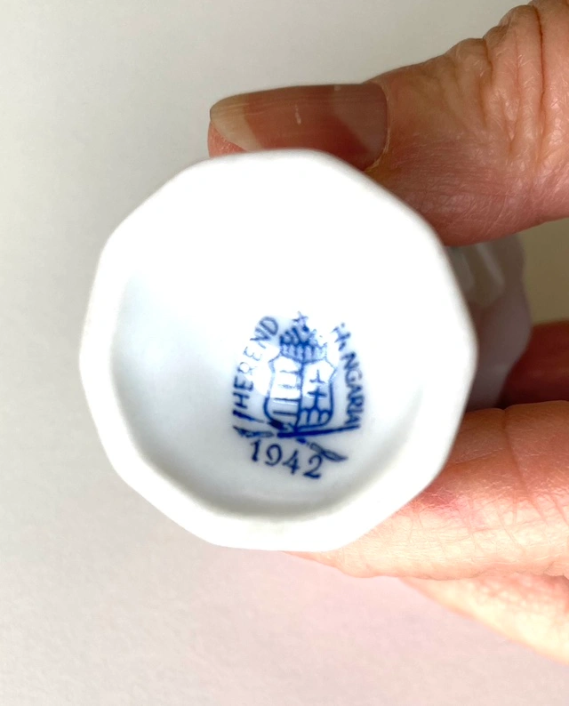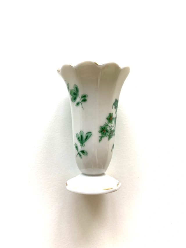 Small decorative piece with green floral pattern. Hand-painted in Hungary with gold trim. Made in 1942. Measures approximately 3 inches tall.