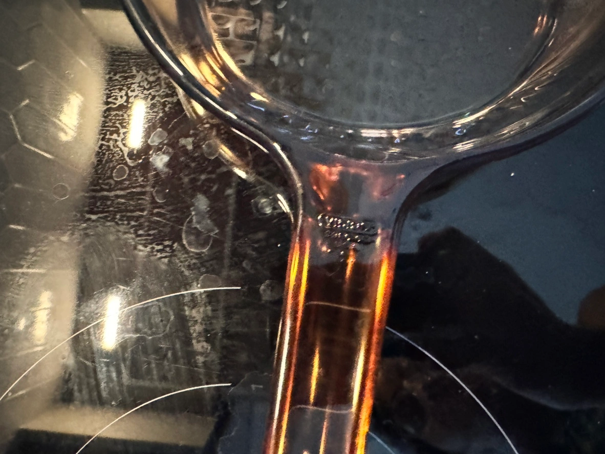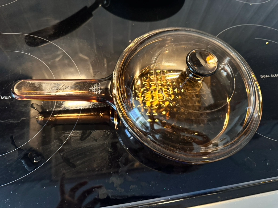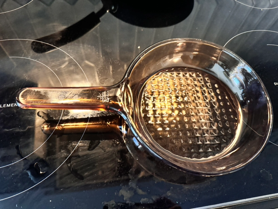 This is a glass frying pan with a glass lid and a brown handle. It has a textured bottom. It is oven safe. It is about 8 inches in diameter.