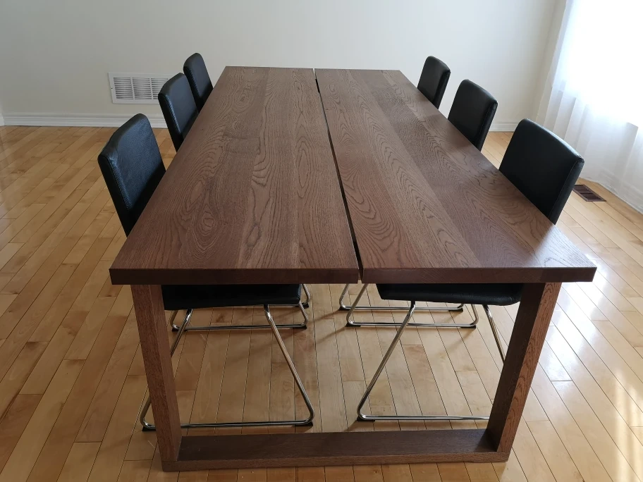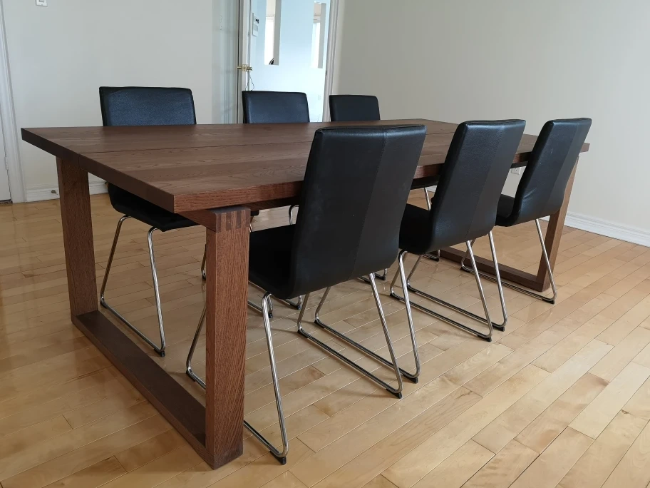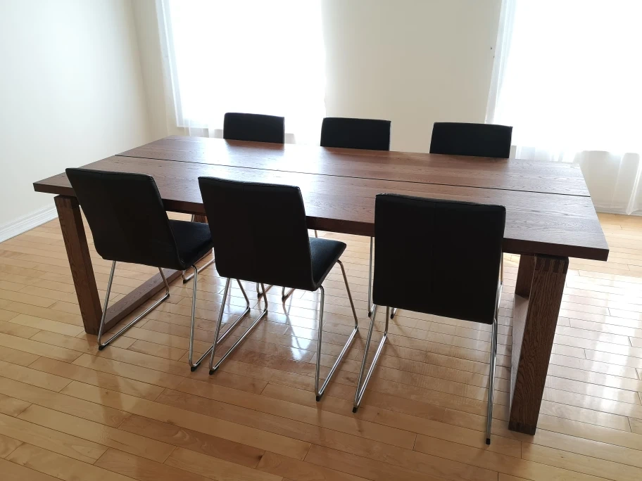 BEAUTIFUL oak veneer brown stained dining table with a minimalist design, featuring a rectangular tabletop and a simple, sturdy base. The table is perfect for seating 6 people comfortably. The oak top layer enhances the plank feeling and details like the floating table top and dovetail joints give the table a crafted look. A table full of character and plenty of room for family and friends. Includes 6 VERY COMFORTABLE chrome plated chairs, offers modern appeal and comfort for all-day activities, with a padded seat shaped to reduce pressure and a flexy-feel backrest. Worry-free, black, easy-wipe coated fabric cover. Original price $1,659.00.