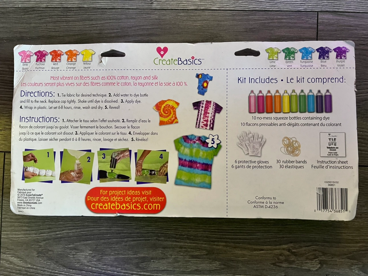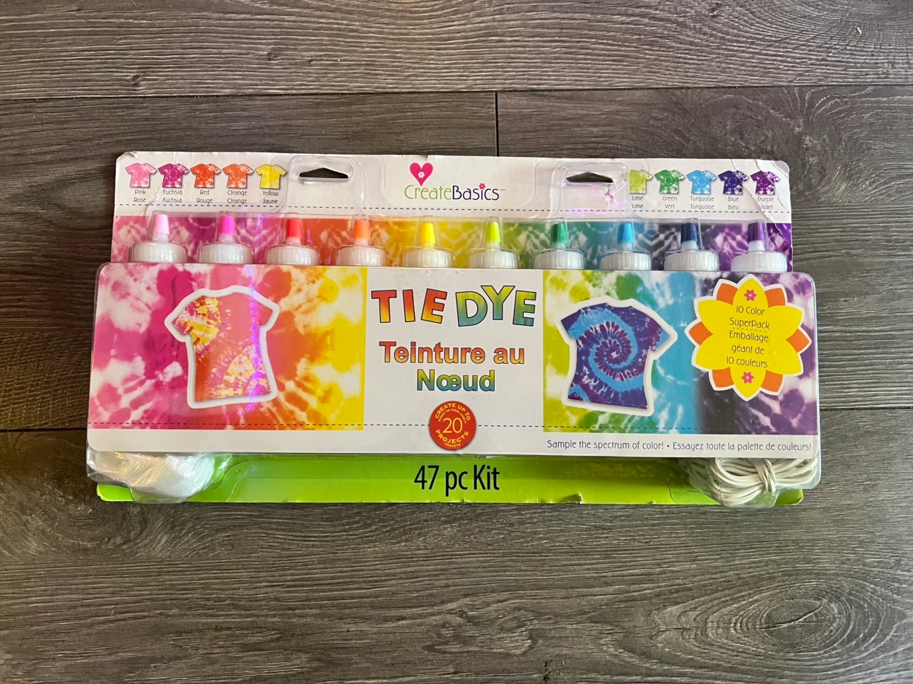 Tie dye kit with 10 colours, rubber bands, gloves and instructions.