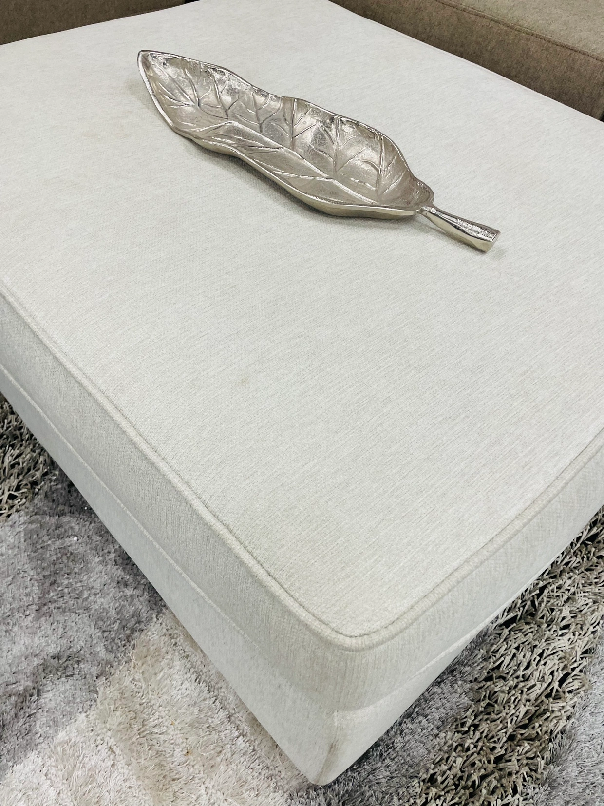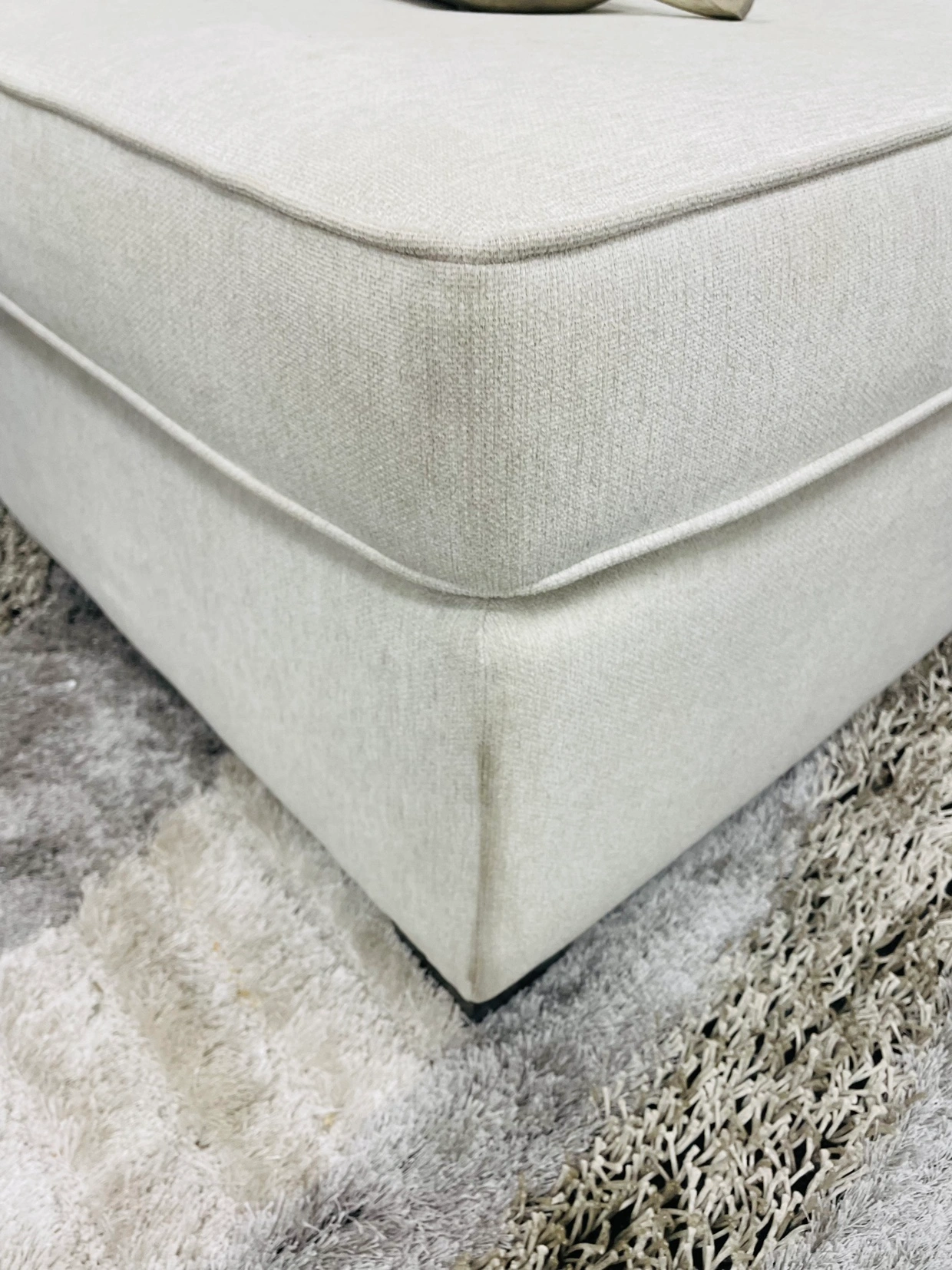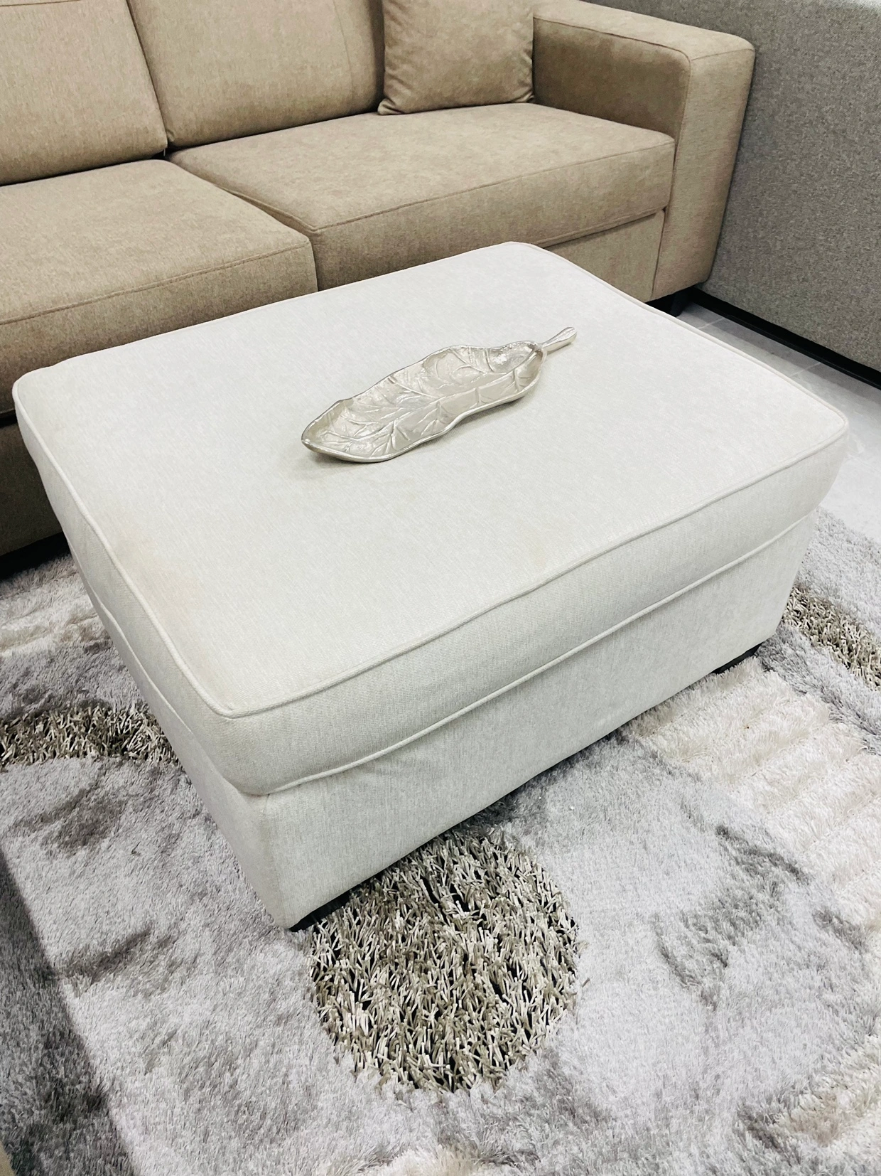Beige ottoman with fabric upholstery in a beige colour. It is large enough to be used as an extra seat. Few stains, going as is.