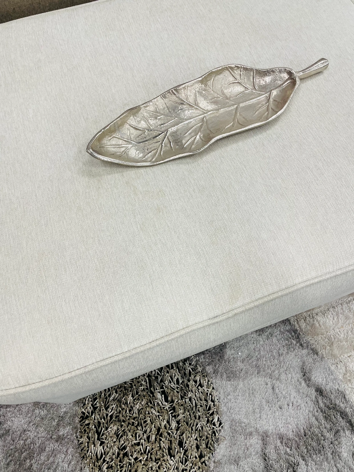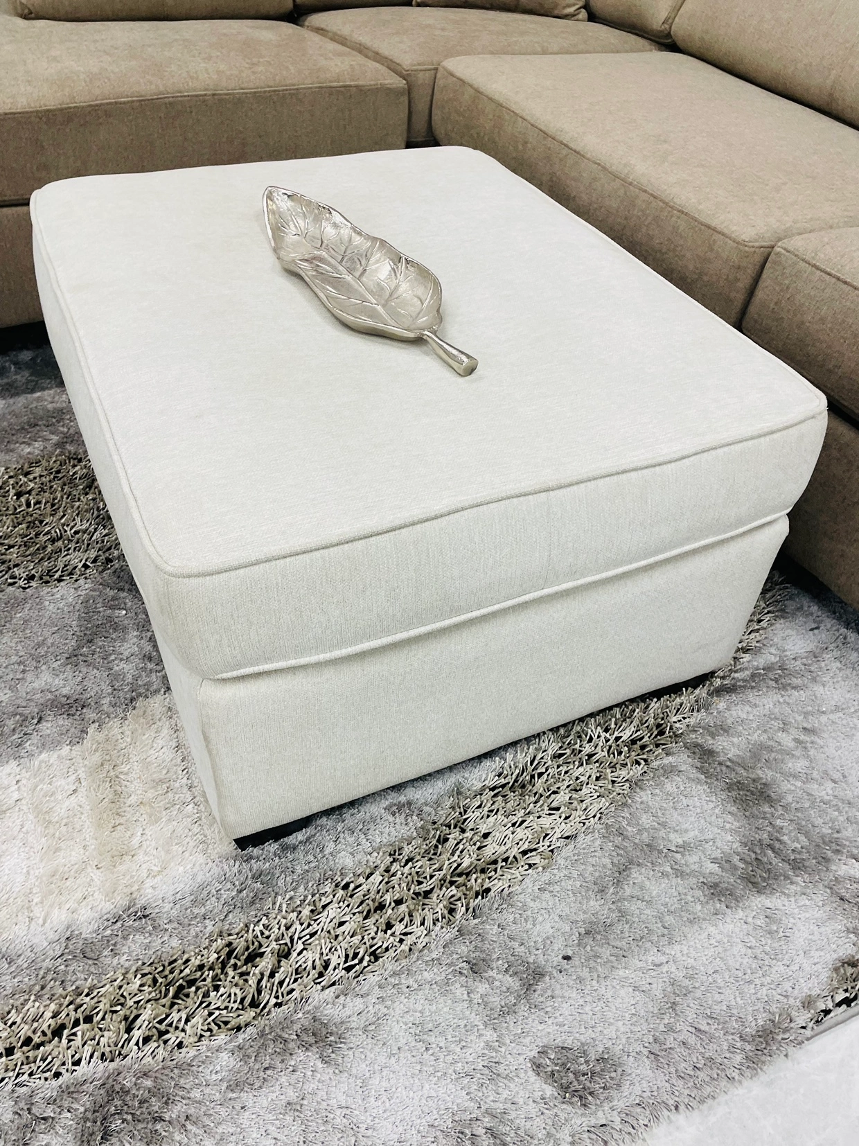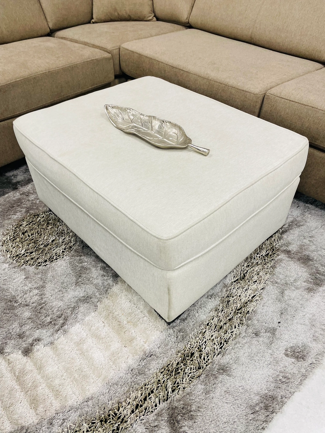 Beige ottoman with fabric upholstery in a beige colour. It is large enough to be used as an extra seat. Few stains, going as is.