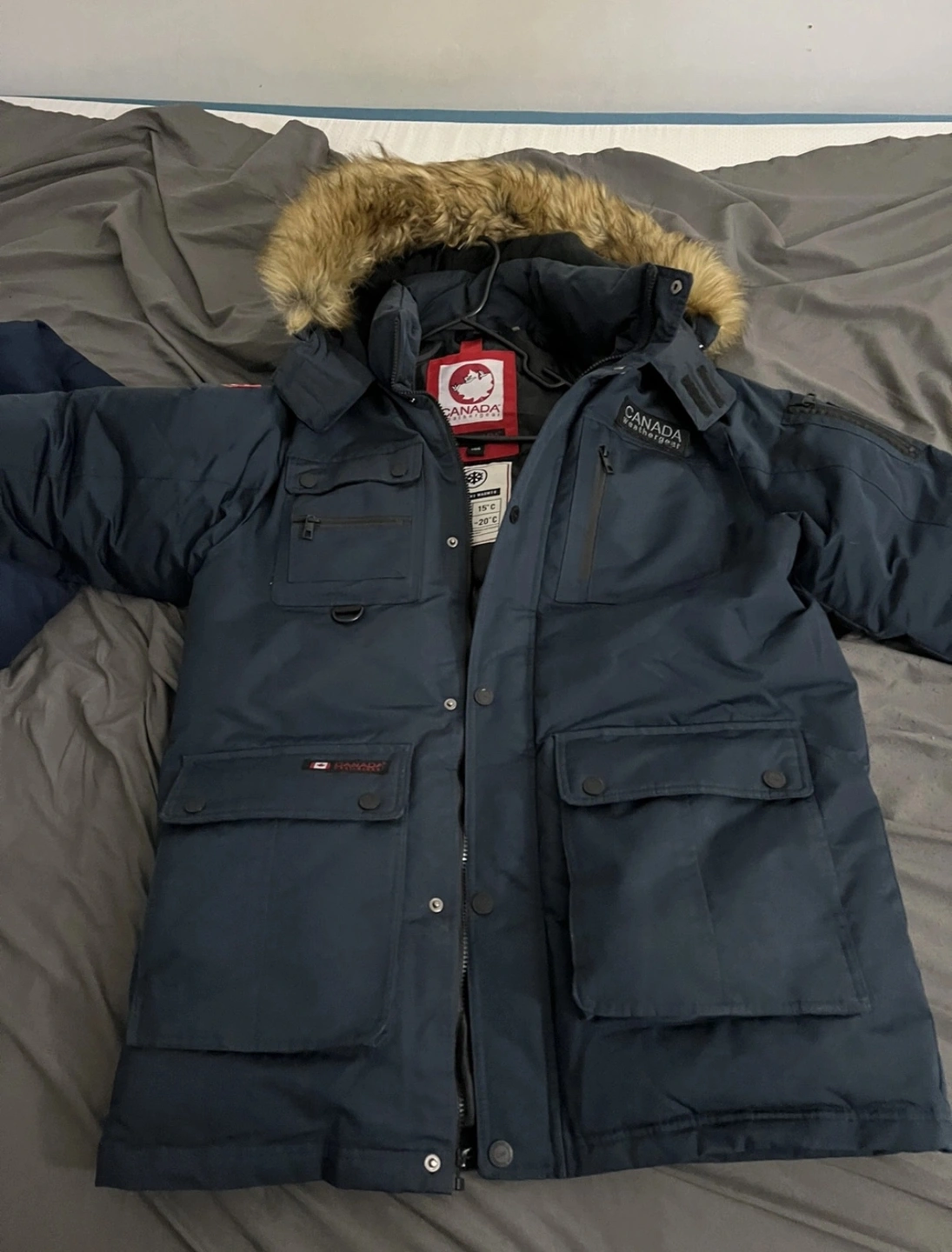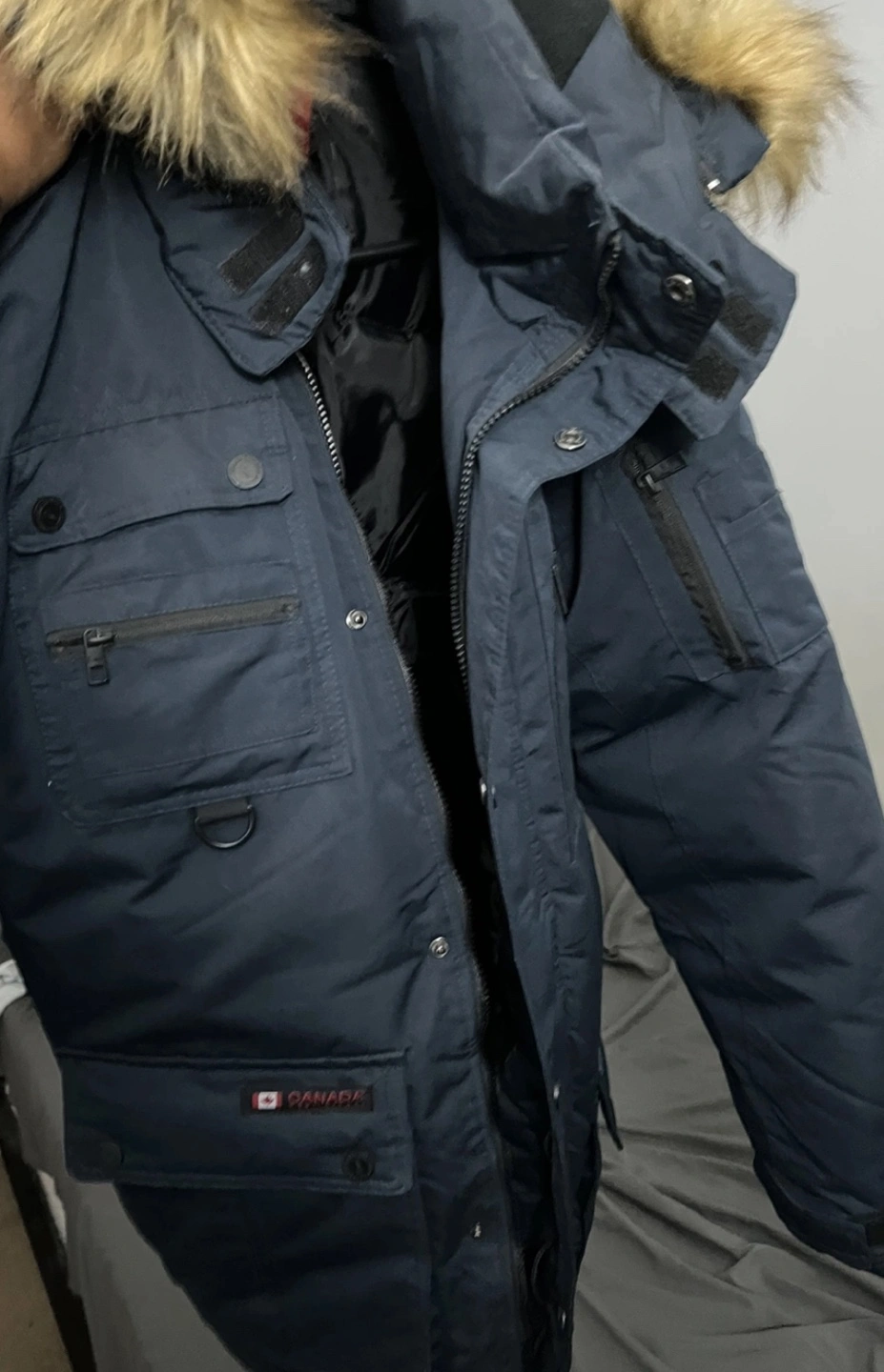 This jacket is in New condition and has a faux fur hood. It's a great coat to keep you warm in the winter!