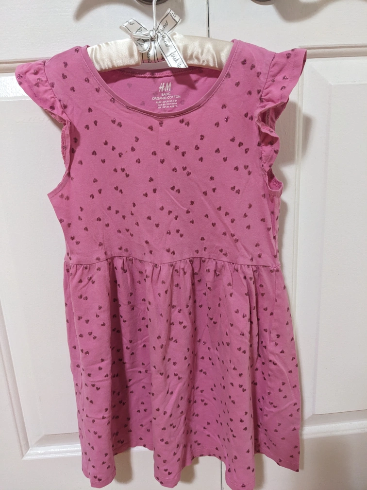 A cute little pink dress with a heart pattern and ruffles on the sleeves. The dress is made of organic cotton.
