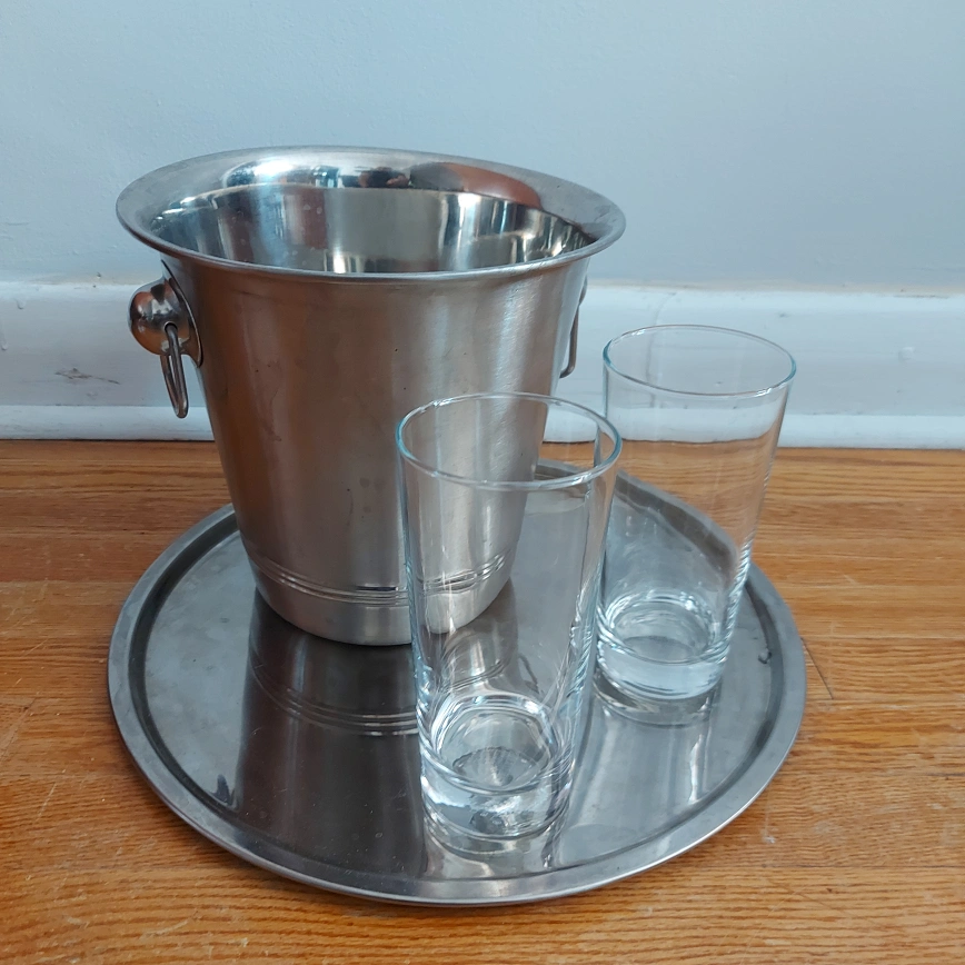 * Discover More Great Deals in My Other Listings! As NEW: This is a silvery serving tray with a champagne bucket and two glasses. The tray, bucket and glasses are in good condition. There are some minor scratches on the tray. --- Special Offer: Bundle with other items from my listings for great discounts. Pickup Only: Item available if listing is visible. Delivery is not available.