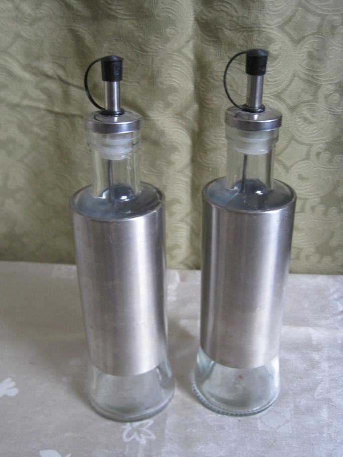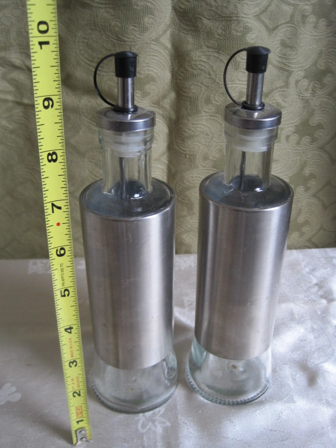 *If ad is up, it's available* *Pick up and cash ONLY* *NO trades or bargaining* *Pick-up location on post* ✅️Set of two glass cruets with stainless steel sheaths. Each bottle has a pour spout. The cruets are approximately 7 inches tall. In excellent condition. No chips or cracks. Includes silicone dripless pourers with flip-top lids. Sf/pf home.